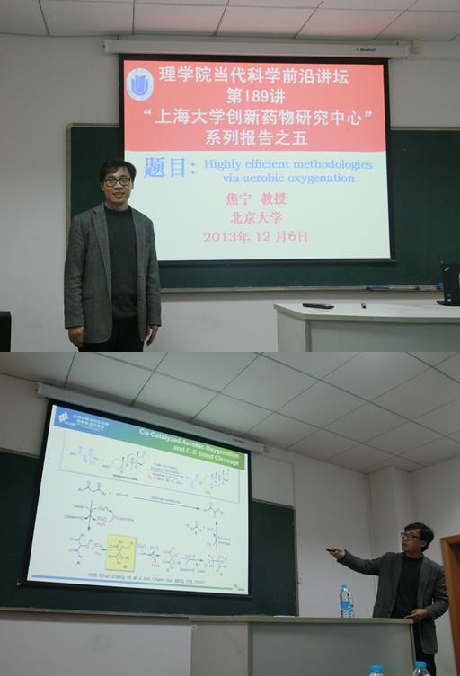 2013年12月6日上午,在校本部HA101,北京大学焦宁教授应邀莅临理学院给师生们作了精彩的学术报告,报告题目“Highly efficient methodologies via aerobic oxygenation”,该学术报告为理学院“当代科学前沿讲坛第189讲”、今日化学系列报告第100讲、sunbet申搏官方网站创新药物研究中心系列报告之五。报告由化学系主任许斌教授主持,系党总支书陈雅丽教授、曹卫国教授、贾学顺教授等80余名化学系师生参加了报告会。