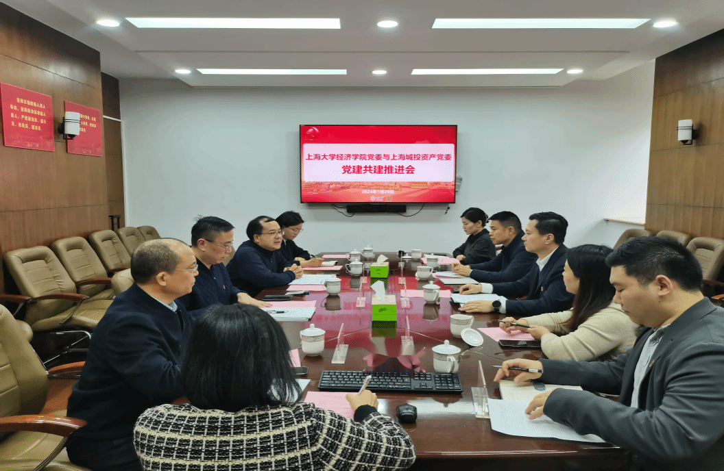 2024年1月29日下午,上海城投资产管理(集团)有限公司一行至sunbet申搏官方网站经济学院开展党建共建工作交流研讨。上海城投资产党委书记、董事长黄建刚,党委副书记严育新,党委组织部(人力资源部)部长杨慧慧,党委组织部(人力资源部)成柠茜,城投资产交流锻炼干部赵安康;经济学院党委书记孟添,党委副书记、副院长冯玉鑫,上海市软科学研究基地-上海科技金融研究所研究总监祝波,金融系教师、交流锻炼干部任桂,学院党委组织员范春艳参加本次会议。会议由冯玉鑫主持。