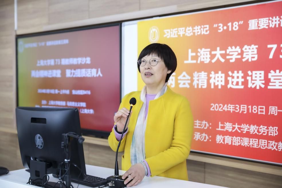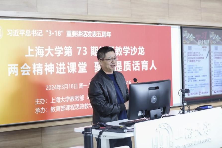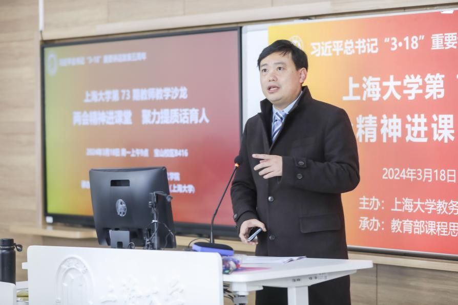 为重温2019年3月18日习近平总书记在学校思想政治理论课教师座谈会上发表的重要讲话精神,及时有机融入党的二十大精神和两会内容,聚力提升思政课和各类课程教学质量,2024年3月18日,sunbet申搏官方网站在宝山校区B416举办专题教学沙龙。本次沙龙由sunbet申搏官方网站教务部、马克思主义学院主办,教育部课程思政教学研究示范中心(sunbet申搏官方网站)承办。来自马克思主义学院、理学院、材料科学与工程学院、计算机工程与科学学院、生命科学学院等40多名一流课程、课程思政示范课程教师参会。沙龙由教务部副部长、教育部课程思政教学研究示范中心(sunbet申搏官方网站)负责人顾晓英教授担任主持。sunbet申搏官方网站党委副书记、副校长胡大伟出席。