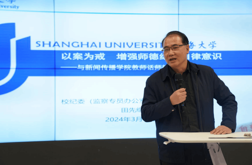 百年大计,教育为先,教育大计,教师为本。为进一步推进学院师德师风建设,全力打造一支有理想信念、有道德情操、有扎实学识、有仁爱之心的高素质教师队伍,近日新闻传播学院在智能媒体研究中心一楼会议厅召开师德师风警示教育大会,会议邀请校纪委(监察专员办公室)派驻延长校区专职纪检员田先纲老师担任主讲嘉宾,新闻传播学院全体教师参加了会议,会议由新闻传播学院党委副书记、副院长王智君主持。