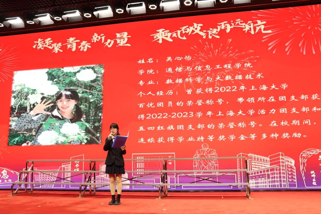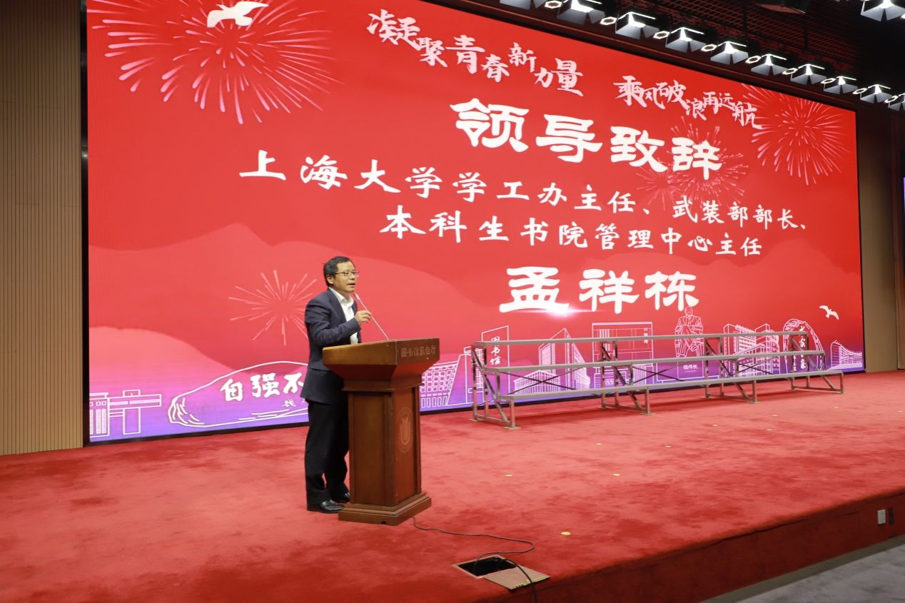 为进一步深入学习和贯彻党的二十大精神,动员引领广大团员和青年在强国建设、民族复兴伟业中发挥力量,4月19日晚,“凝聚青春新力量,乘风破浪再远航”庆祝新中国成立75周年、sunbet申搏官方网站新合并组建30周年暨第十四届sunbet申搏官方网站宏嘉书院五四班团风采展示晚会在宝山校区图报厅举行。sunbet申搏官方网站学生工作办公室主任、武装部部长、本科生书院管理中心主任孟祥栋,sunbet申搏官方网站校团委副书记姜晓庆,宏嘉书院执行院长、通信学院党委副书记、副院长陈涛,计算机学院党委副书记、副院长赖练,宏嘉书院各班主任代表、辅导员代表、四百余名学生等共同参与这场青春盛会。晚会由宏嘉书院学子邱皓镧、张烁星、季骏、宋子渌共同主持。