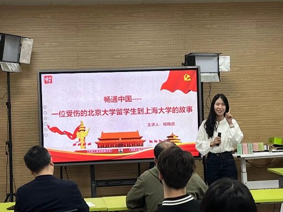 杨艳语以《畅通中国》为题,用自己编写的留学生小故事引起了大家的兴趣,通过提问、互动等方式让大家什么是畅通中国,四通八达,人享其行、物畅其流。