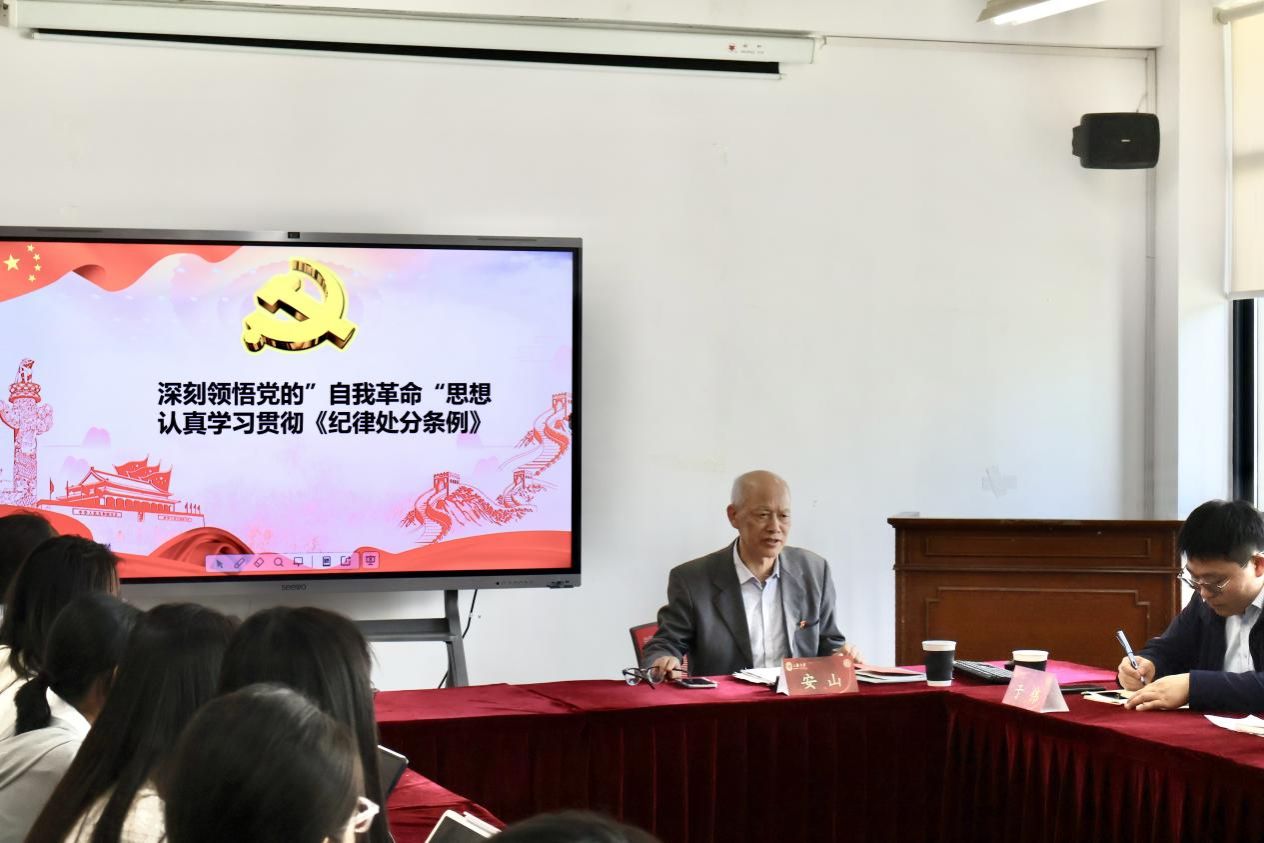 随后,安山老师进行了精彩的党纪学习教育主题报告。安老师指出,习近平总书记关于党的自我革命的重要思想深入阐述了我们党“为什么要自我革命”“为什么能自我革命”“怎样进行自我革命”三个问题,指明了党永葆初心、担当使命的根本任务,展现了党永葆生机活力、走好新的赶考之路的光明前景。安老师结合具体的案例阐释了强化纪律意识,严守纪律底线的重要意义,深入分析了认真学习贯彻《中国共产党纪律处分条例》的重要价值,并详细解读了条例修订的主要内容和显著特点。安老师的报告深入浅出,既有理论高度又有清晰的历史经纬,并不时穿插鲜活的警示案例,让与会师生深受启发和教育。