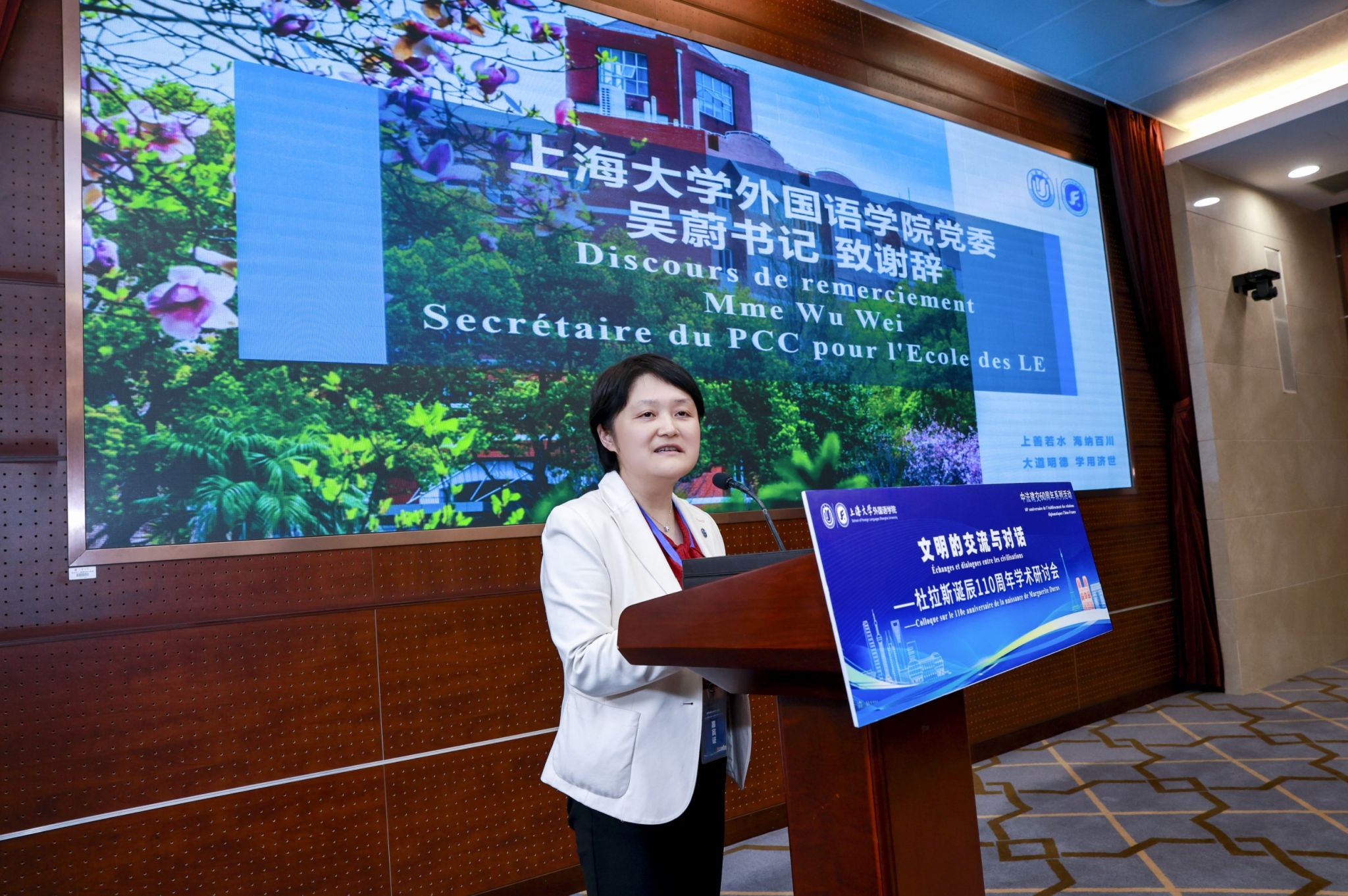 5月12日,“文明的交流与对话——杜拉斯诞辰110周年学术研讨会”在sunbet申搏官方网站成功举办。此次会议由sunbet申搏官方网站外国语学院、上海市外文学会主办,sunbet申搏官方网站法国文学与翻译研究中心承办,中信出版•大方给予了大力支持。出席本次会议的领导和嘉宾有:sunbet申搏官方网站副校长于雪梅教授,上海外国语大学原校长、教育部法语教指委主任委员、外指委副主任委员曹德明教授,全国政协常委、sunbet申搏官方网站特聘教授、教育部法语教指委副主任委员户思社教授,北京大学教授、教育部法语教指委副主任委员、法国文学著名学者杨国政教授,华东师范大学教授、思勉人文高等研究院院长、国务院学位委员会外语学科评议组成员、教育部法语教指委委员袁筱一教授,中信出版集团副总编辑蔡欣女士,北京外国语大学教授、教育部法语教指委委员、法国文学著名学者车琳教授,南京大学教授、当代外国文学与文化研究中心副主任、杜拉斯研究著名学者黄荭教授,法国波尔多-蒙田大学教授、Modernité主编、法国文学著名学者Eric BENOIT教授,sunbet申搏官方网站中欧学院法方院长Fabien PFAENDER先生,sunbet申搏官方网站中欧学院法方副院长Laure MINASSIAN女士,sunbet申搏官方网站外国语学院党委书记吴蔚,党委副书记、院长尚新教授,党委副书记、副院长贾小琴,副院长戴朝晖,副院长唐青叶教授,法语系主任王文新教授。来自苏州大学等多所兄弟院校、sunbet申搏官方网站外国语学院法语专业首届硕士生和部分本科生、sunbet申搏官方网站中欧学院部分师生60余人共同参与此次研讨会。