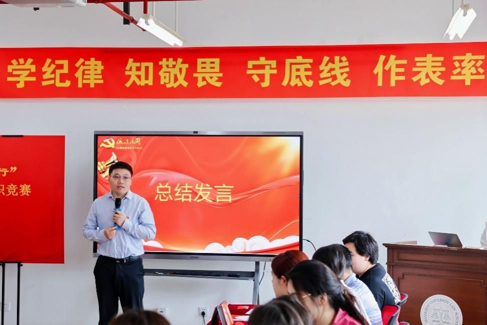 法学院党委副书记、副院长于伟为本次活动作总结发言。于伟首先对策划和组织活动的工作人员的辛勤付出表示感谢,对参赛队伍展现出的党纪知识表示认可。并鼓励大家以这次竞赛作为检验每个人党纪学习情况的良好契机,继续以更加饱满的热情和更高的标准投入到党纪学习教育中去,把党纪知识内化于心外化于行,让党纪真正成为每位党员的通行证和护身符。