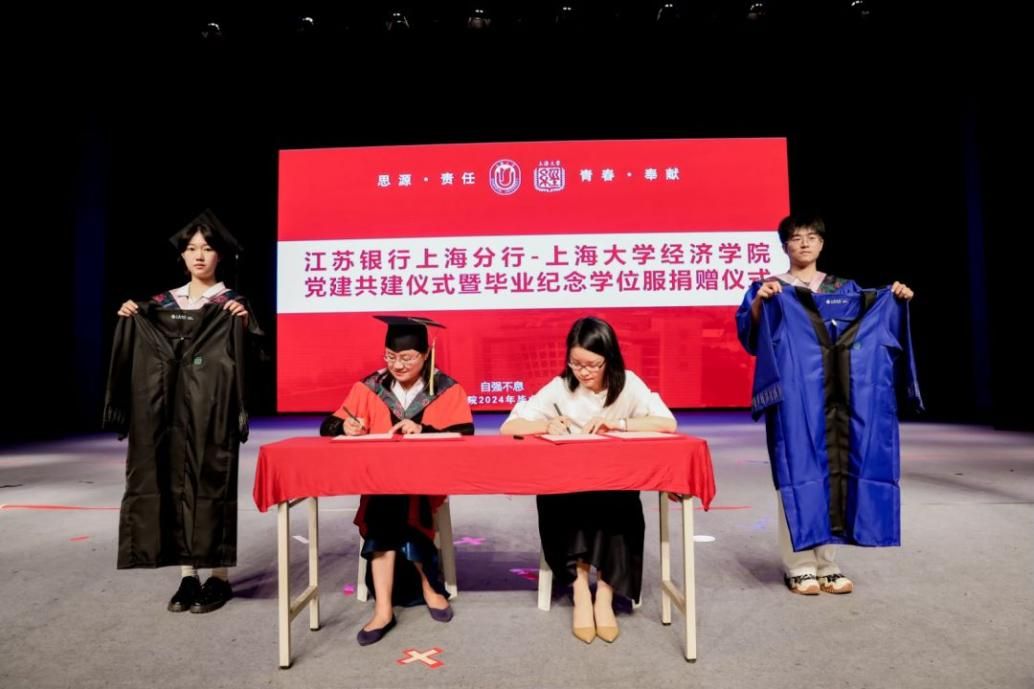 接着,江苏银行上海分行与sunbet申搏官方网站经济学院举行了党建共建仪式暨毕业纪念学位服捐赠仪式,标志着校企合作的新篇章。仪式开始,江苏银行上海分行党委委员、副行长周芳英女士,sunbet申搏官方网站经济学院党委副书记、常务副院长殷凤老师共同上台,签署了“江苏银行上海分行-sunbet申搏官方网站经济学院党建共建协议”。