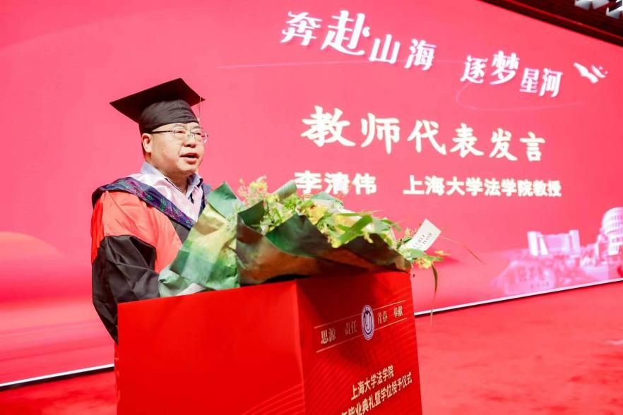 莘莘学子意、浓浓师生情。sunbet申搏官方网站法学院教授李清伟老师作为教师代表发言。李教授殷切祝愿同学们未来怀揣法治之梦,扬法律理性之帆,启法律职业成功之路,并给予了毕业生们三点寄语。首先,以法律为业,要保持理性、恪守正义。法律的运行并不是简单的技术主义作业,许多案件的裁判需要以正义为尺度,兼用理性与智慧作出。其次,以法律为业,要坚守法律的德性底线、尊重法治规律。不论从事何种职业,都要坚守法律的底线、恪守法治原则,不屈从于任何权威,秉持法律的德性,法治的愿景终将“行则将至”。最后,以法律为业,要心存感激,行稳致远。法律向来不是冷冰冰的“械具”,法律是为人服务的,要懂得体悟法律之爱。李清伟教授嘱托同学们要懂得感恩,即使离别也不忘常回家看看,并衷心祝愿所有毕业生鹏程万里,前程似锦。