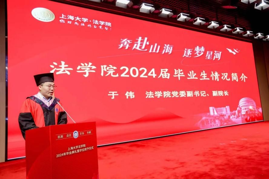 法学院党委副书记、副院长于伟首先介绍法学院2024年毕业生的整体情况。2024年,法学院共有157名全日制硕士研究生、133名本科生顺利毕业,其中60余名同学前往北京大学、中国政法大学、华东师范大学、同济大学、多伦多大学、曼彻斯特大学、香港中文大学、莱顿大学等国内外知名学府继续深造,本科生升学深造率再创新高;百余名毕业生已经落实政府公务员、律所、公司企业、事业单位等就业去向;学院唯一的本科生党支部中夏党支部全体本科生党员实现100%的高质量就业,充分展示了sunbet申搏官方网站法学院培养全面发展的卓越法治人才的育人成效。另外,法学院还有近80名非全日制研究生顺利毕业。