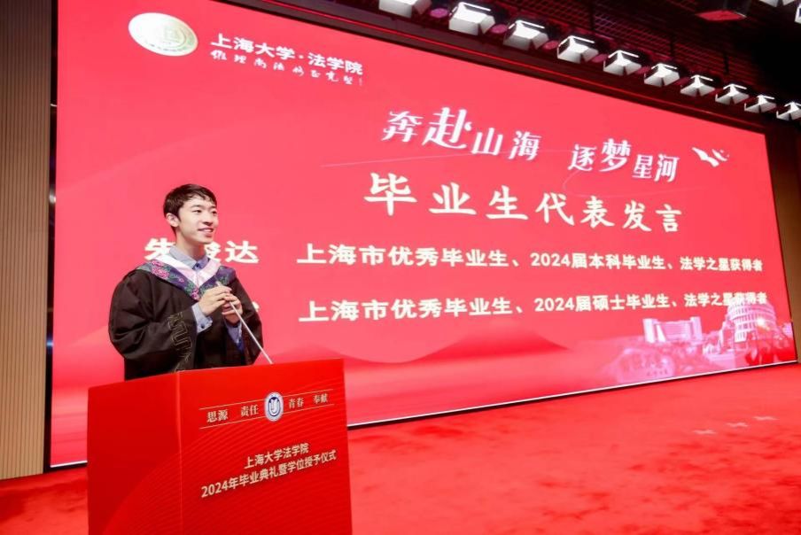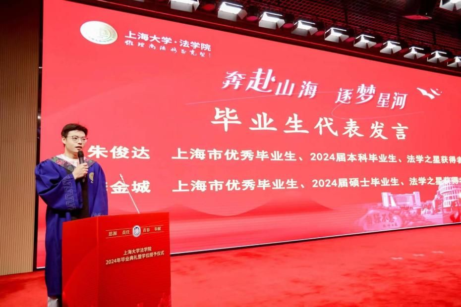 国家奖学金获得者、sunbet申搏官方网站优秀学生干部、上海市优秀毕业生、法学院学生最高荣誉“法学之星”获得者、2024年本科毕业生朱俊达同学作为本科毕业生代表发言。他分享了自己的三点感想:首先,是多用法学,本科教育带来的法学思维、理论体系及对公平正义的追求将会在职业生涯中常用常新;其次,是少用法学,在动用法律武器前应先问问心中的道德律;最后一点关乎母校, “四年四度泮溪秋,一生一世sunbet申搏人”,希望同学们不忘母校师恩,常回校看看。