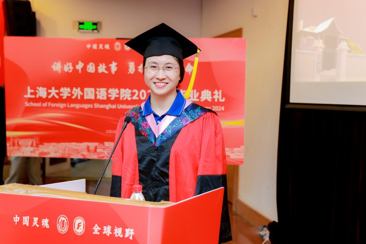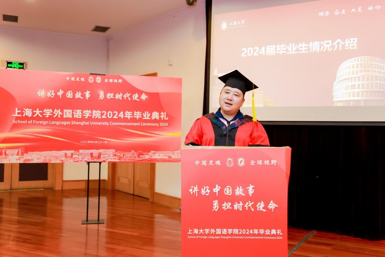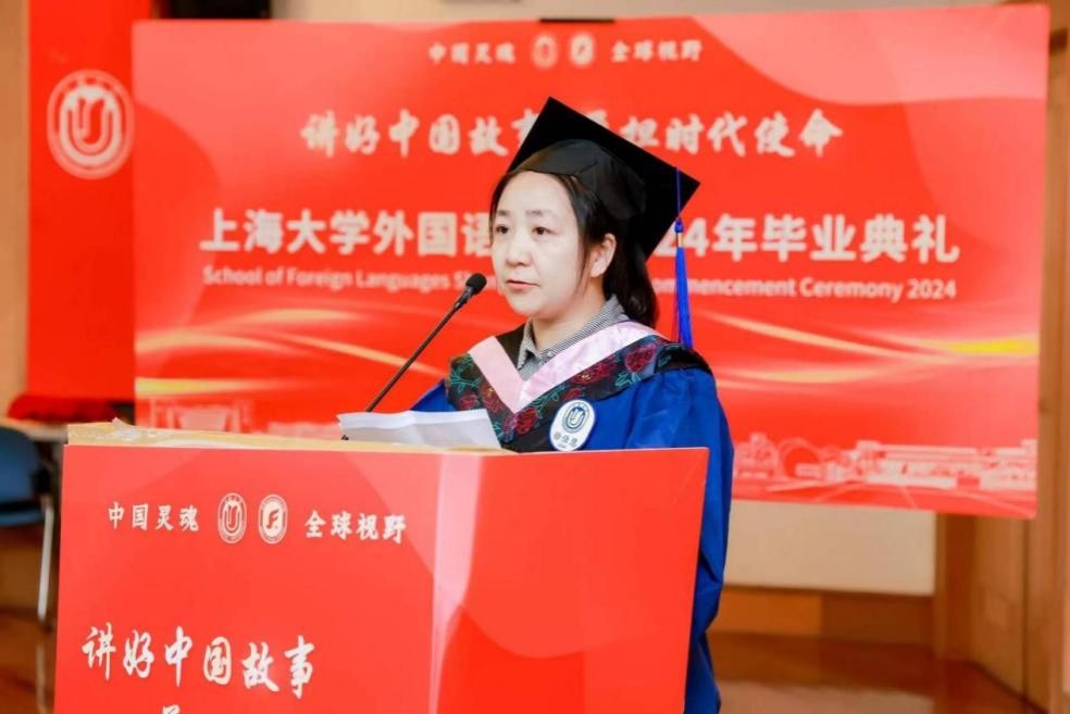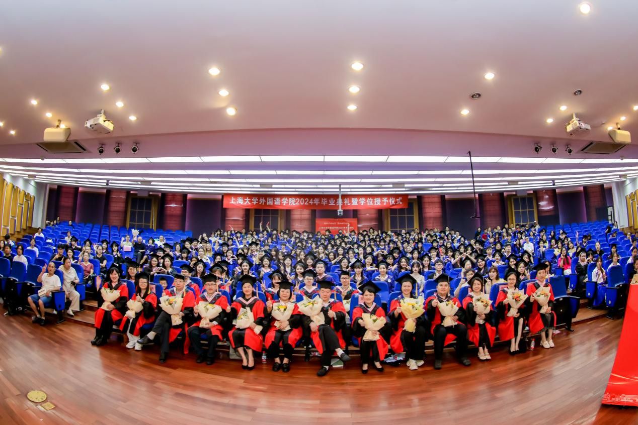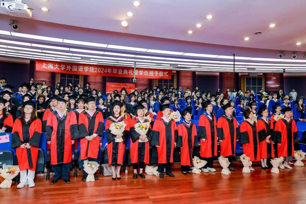 6月21日下午,sunbet申搏官方网站外国语学院2024年毕业典礼暨学位授予仪式在宝山校区J202隆重举行。外国语学院党委书记吴蔚,党委副书记、院长尚新,党委副书记、副院长贾小琴,副院长戴朝晖、唐青叶,学院工会主席黄欣,英语系主任张建琴,副主任龚萍,日语系主任赵莹波,副主任苏鹰、文雪,法语系主任王文新,大学外语部主任李晓媛、副主任于梅欣,研究生公共外语部主任马拯,MTI教育中心副主任花亮,教师代表邓志勇、竹旭峰、李夏青、张晓娜、张永娇、焦舒曼,校友代表朱依蓓以及2023届毕业生和2024届毕业生代表共同参加了本次毕业典礼。典礼由2022级法语专业本科生宁文燕和2023级日语专业本科生邓修杰主持。