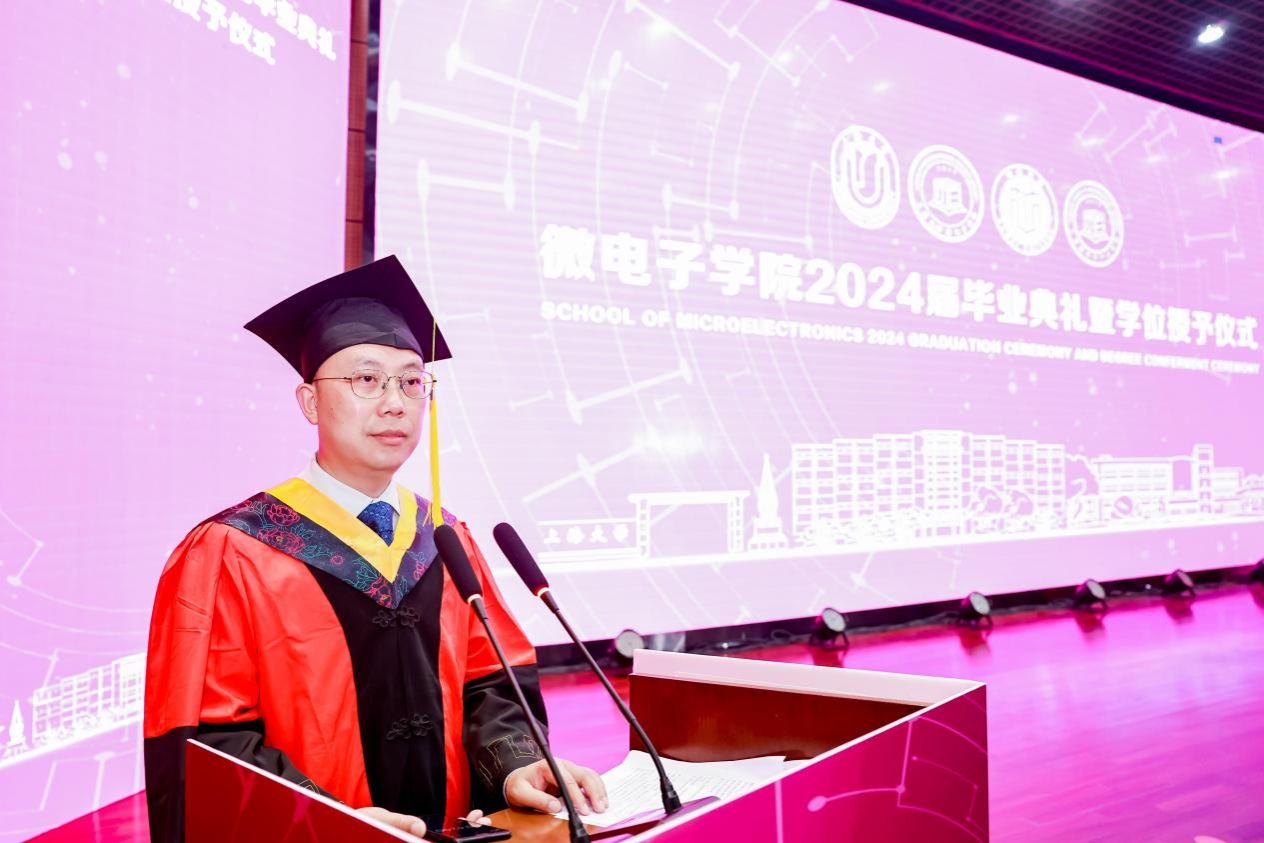 6月23日上午,sunbet申搏官方网站微电子学院2024届毕业典礼于嘉定校区行健文体中心举行。sunbet申搏官方网站副校长、微电子学院执行院长张建华,微电子学院党委书记郭纯生,院长赵建龙,党委副书记、副院长袁铭,党委副书记余丽娜,副院长胡挺,周婷、路秀真,校友代表、联培单位代表及学院全体导师出席典礼,2024届毕业生及毕业生家长代表共赴这场盛会。