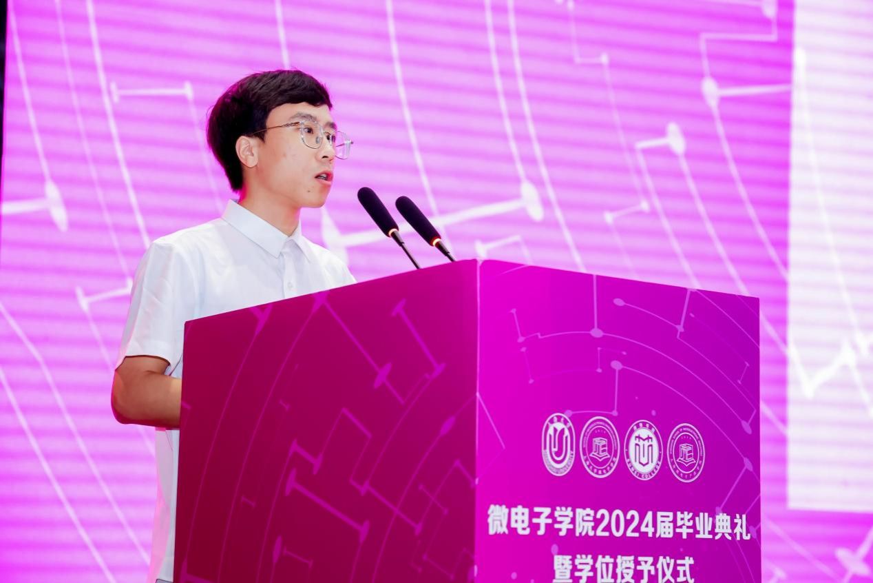 校长奖学金获得者、市优秀毕业生、微电子科学与工程专业本科生孙佳晨,市优秀毕业生微电子学与固体电子学专业研究生代表张文魁回顾了在校园内的无数难忘回忆,感谢学院和微电子全体教师们的培养和关怀,同时表达了心怀国之大者的报国之志和为集成电路事业发展而奋斗的决心。