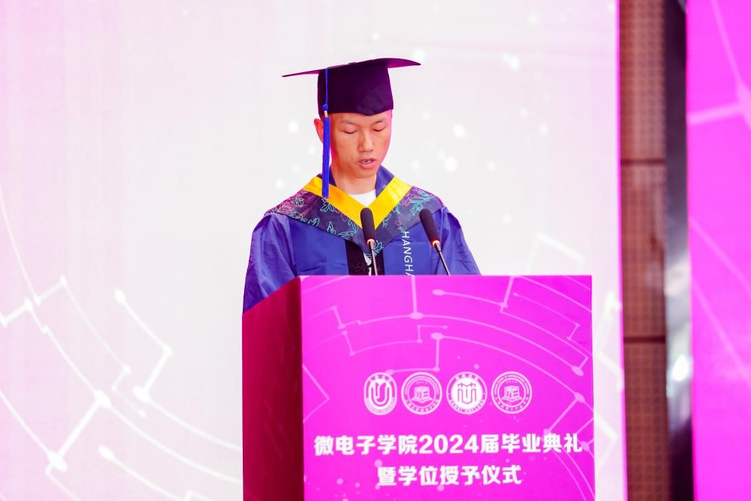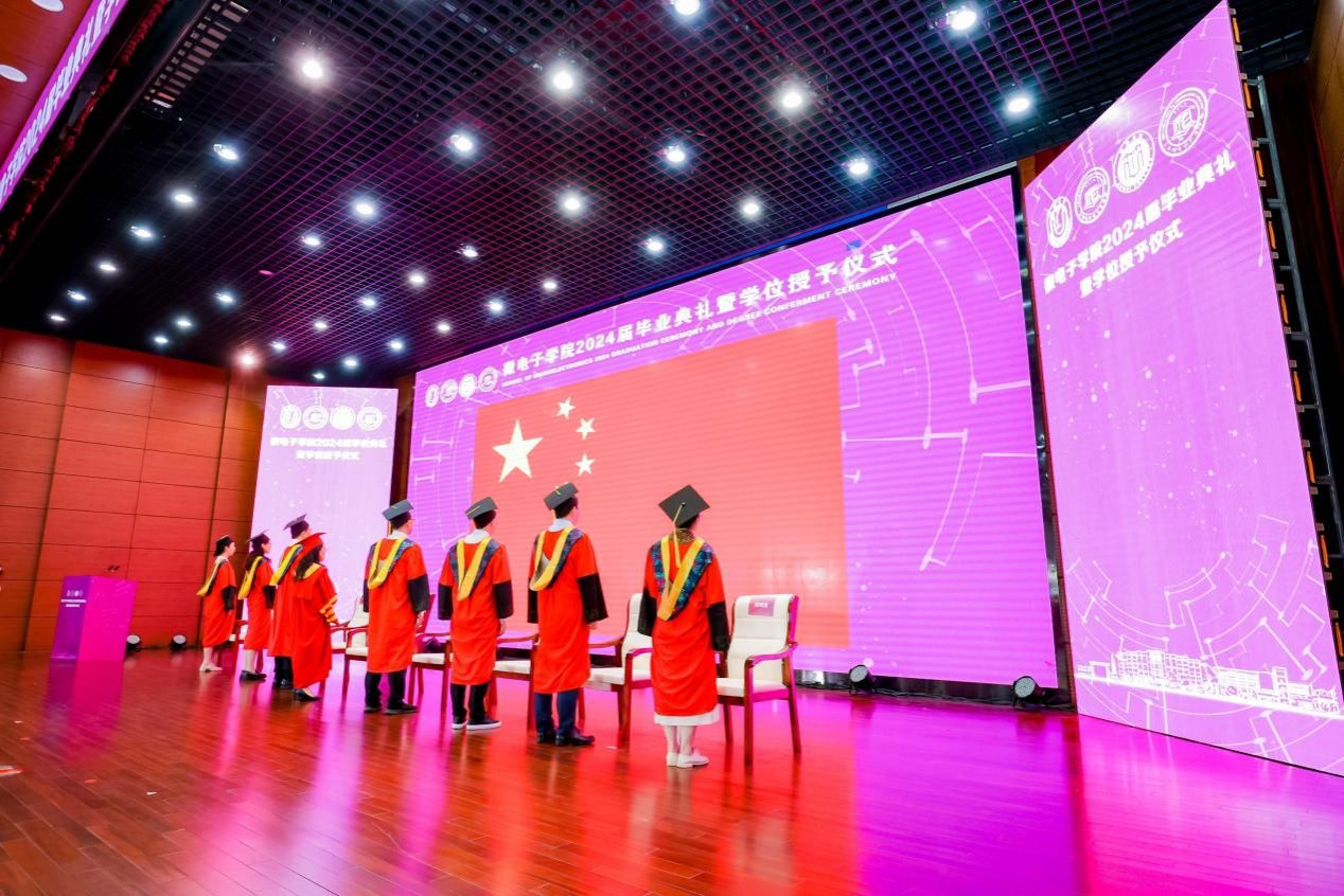 伴随着国歌的嘹亮奏响,全场洋溢着青春的激情。这是一场期待已久的典礼,同时也象征着2024届学子们即将告别校园,迈向人生新篇章的重要时刻。微电子学院2024届毕业生中,本科生超过60%的同学将赴境内外知名高校深造,直接就业的研究生中有超过90%的同学即将奔赴集成电路相关企业及其相关岗位建功立业。