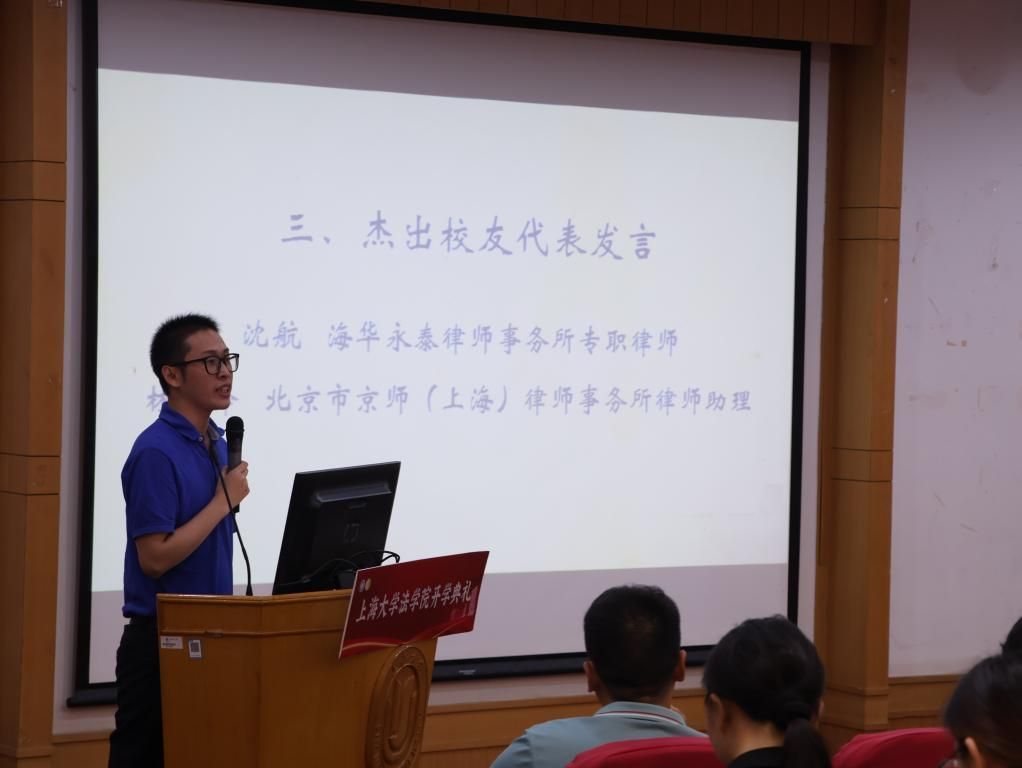 随后,海华永泰律师事务所专职律师沈航律师作为杰出校友代表和同学们进行了分享。沈航律师基于亲身经验,建议同学们多关注并全力以赴地参与到各类法律比赛中,作为律师,不仅需要良好的体力,细心与责任心也不可缺少。最后,沈航律师表达了希望老师们身体健康,同学们前程似锦的美好祝福。
