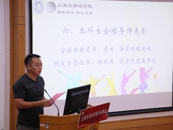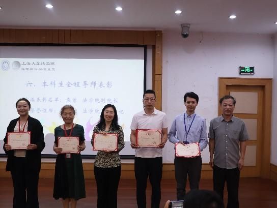 法学院副院长袁曾老师宣读了表彰名单,法学院党委书记徐国明老师为五位优秀本科生全程导师颁发证书并合影留恋。