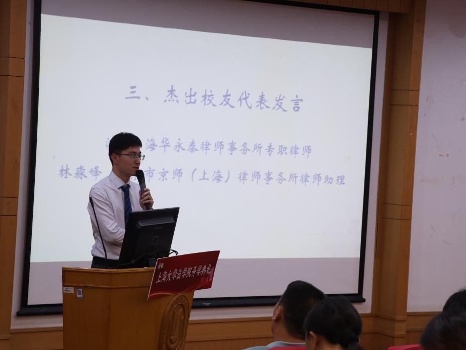 北京市京师(上海)律师事务所律师助理林淼峰律师作为杰出校友代表发言。林淼峰律师围绕勇气这一关键词与同学们进行了分享。林淼峰律师认为在律师工作中,需要具有不断学习、面对变化和承担责任的勇气。勇气把宏大的法律价值投射进社会的缝隙中,希望同学们能成为一个勇敢的法律人。