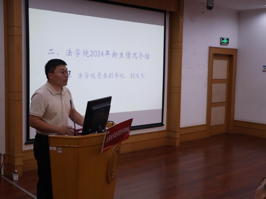 党委副书记、副院长于伟老师介绍了2024年法学院本科生与研究生的新生情况。2024年,法学院共迎来了327名新生。青年向上,国家向前。希望这327名新生能够尽快融入法学院的大家庭,并秉承法学院维理尚法,恪正克坚的院训精神,励志笃学,铭记使命,做一名温和而又坚定的法律人!