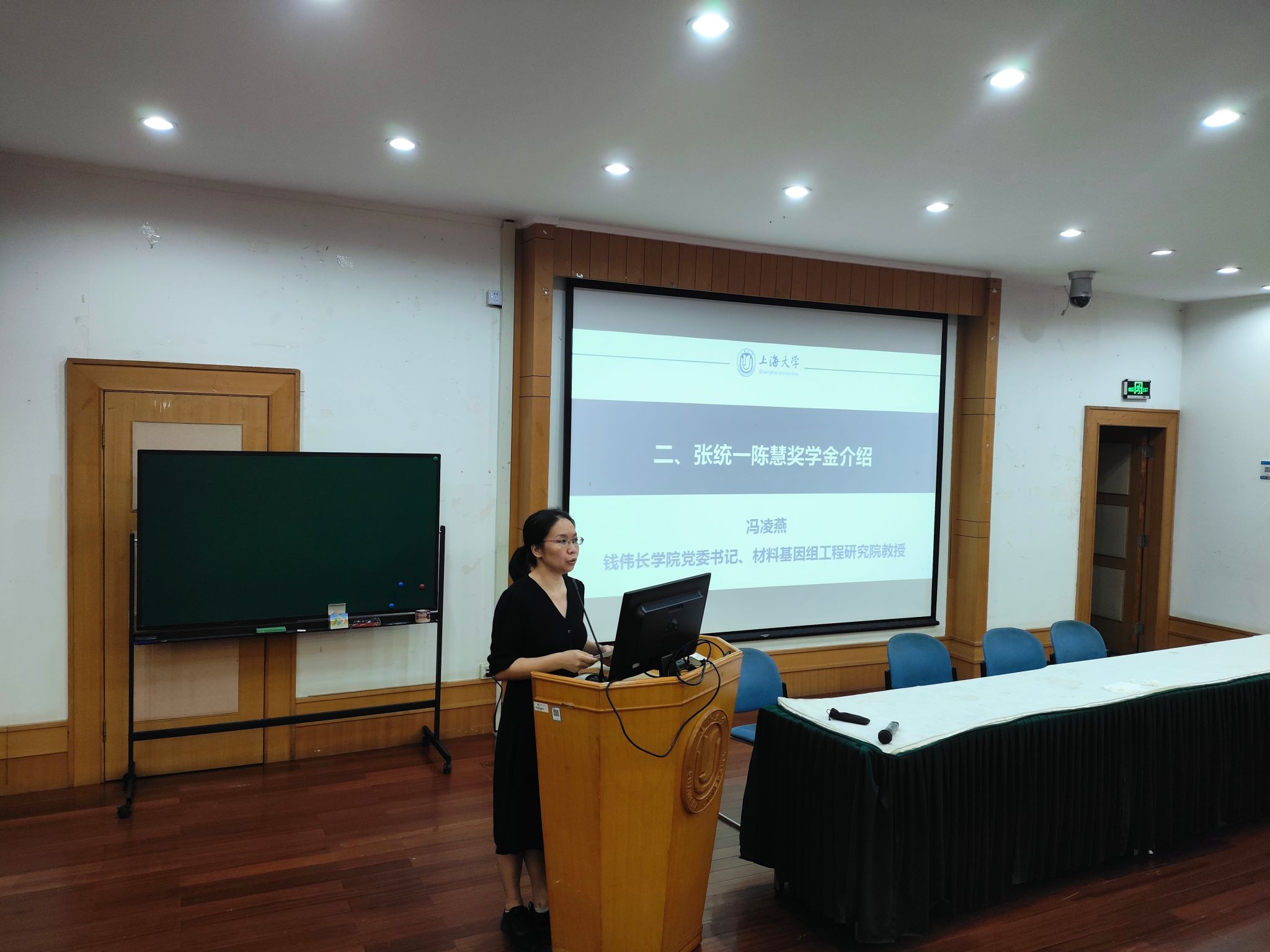 随后,冯凌燕书记向新生介绍了“张统一陈慧奖学金”的设立情况,本项奖学金是以张统一院士与其夫人姓名命名,为鼓励与支持sunbet申搏学子投身AI for Materials研究而设。并介绍了往届“张统一陈慧奖学金”获得者在钱伟长学院与材料基因组工程研究院联合培养模式下的学习经历与成长心得,鼓励新生们向榜样看齐。