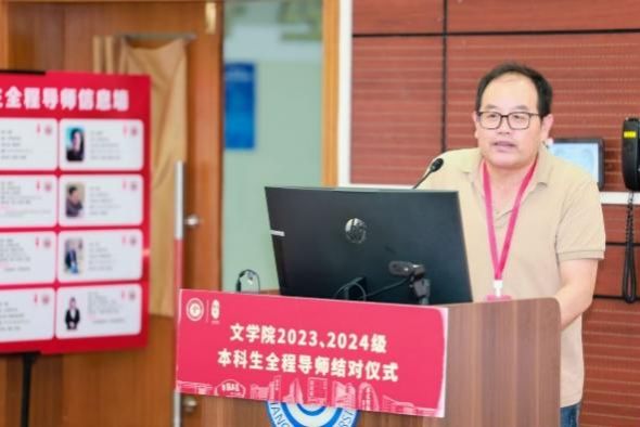 随后举行师生结对仪式,分别由2023级本科生代表和2024级本科生代表为各自年级的导师代表送上绿植并合影留念,希望桌案上这一抹绿色能为导师驱散疲惫,也代表着学生的敬意与感谢。顾甦泳老师作为2023级学生全程导师代表,向同学们分享了鲁迅先生在作品《导师》中的一段话,给予同学们勉励与动力。2024级学生全程导师代表,文学院副院长杨长云老师则对同学们的未来提出了要求与期待,他希望同学们能够珍惜学校提供的学习和发展机会,好好享受在文学院学习生活的时光,实现自己的梦想,也希望老师们能够在做人、做事、做学问方面进行尽心尽力,做好人文关怀,带领同学们实现梦想。