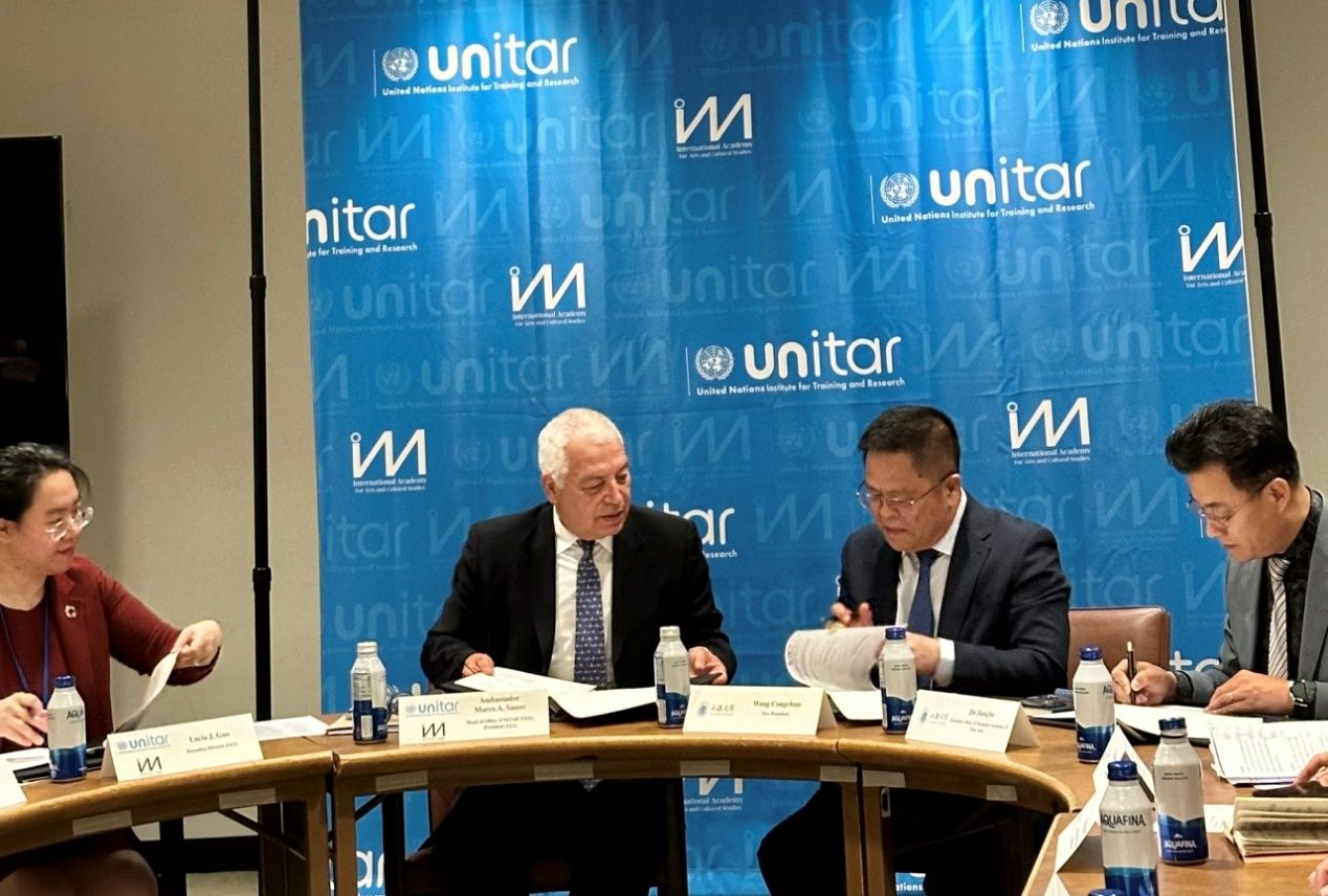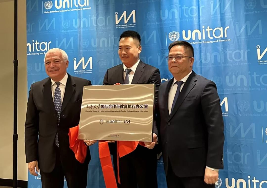 在纽约,代表团访问了联合国训练研究所及其所属的全球文化与艺术组织。王从春副校长与联合国训练研究所所长、全球文化与艺术组织主席Marco A. Suazo大使进行了会晤。双方共同签署了谅解备忘录,并为“sunbet申搏官方网站国际合作与教育执行办公室”揭牌。双方就后续合作进行了深入交流,将共建国际文化、科技和艺术教育中心,全球城市更新与可持续发展学术智库,助力sunbet申搏官方网站培养国际组织人才。
