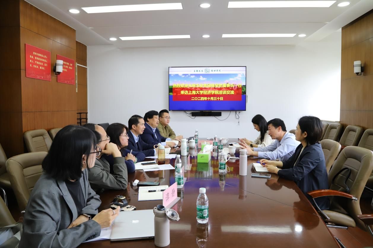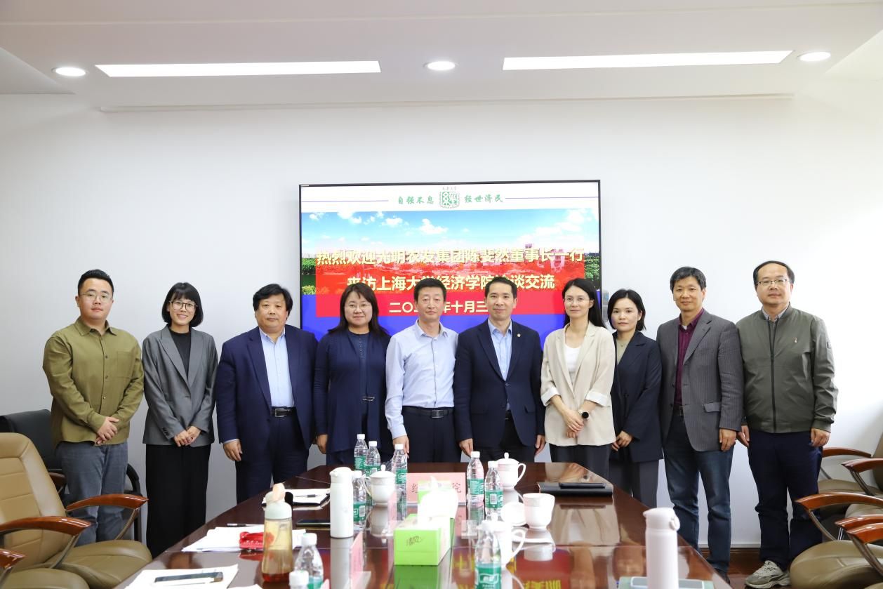 10月30日上午,光明农发集团党委书记、董事长陈斐然,党委副书记、纪委书记、工会主席严如娟,党委工作部部长王珍巧一行来访sunbet申搏官方网站经济学院洽谈交流。经济学院党委书记尹应凯,党委副书记、常务副院长殷凤,党委委员、聂永有教授,党委副书记、副院长冯玉鑫,党委委员、副院长刘康兵,党委委员、副院长谭静以及外联秘书杜天宇参加了本次交流座谈。