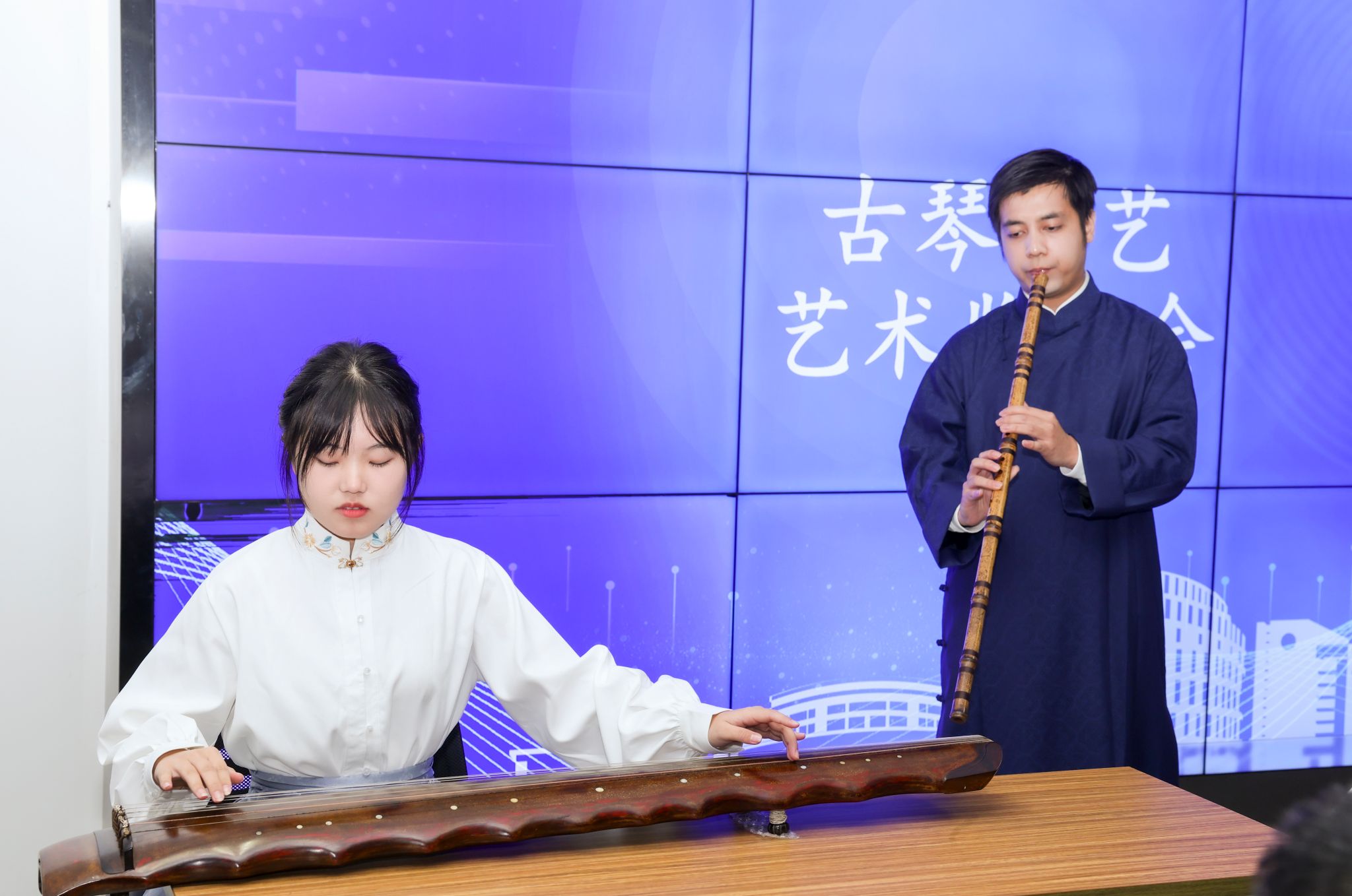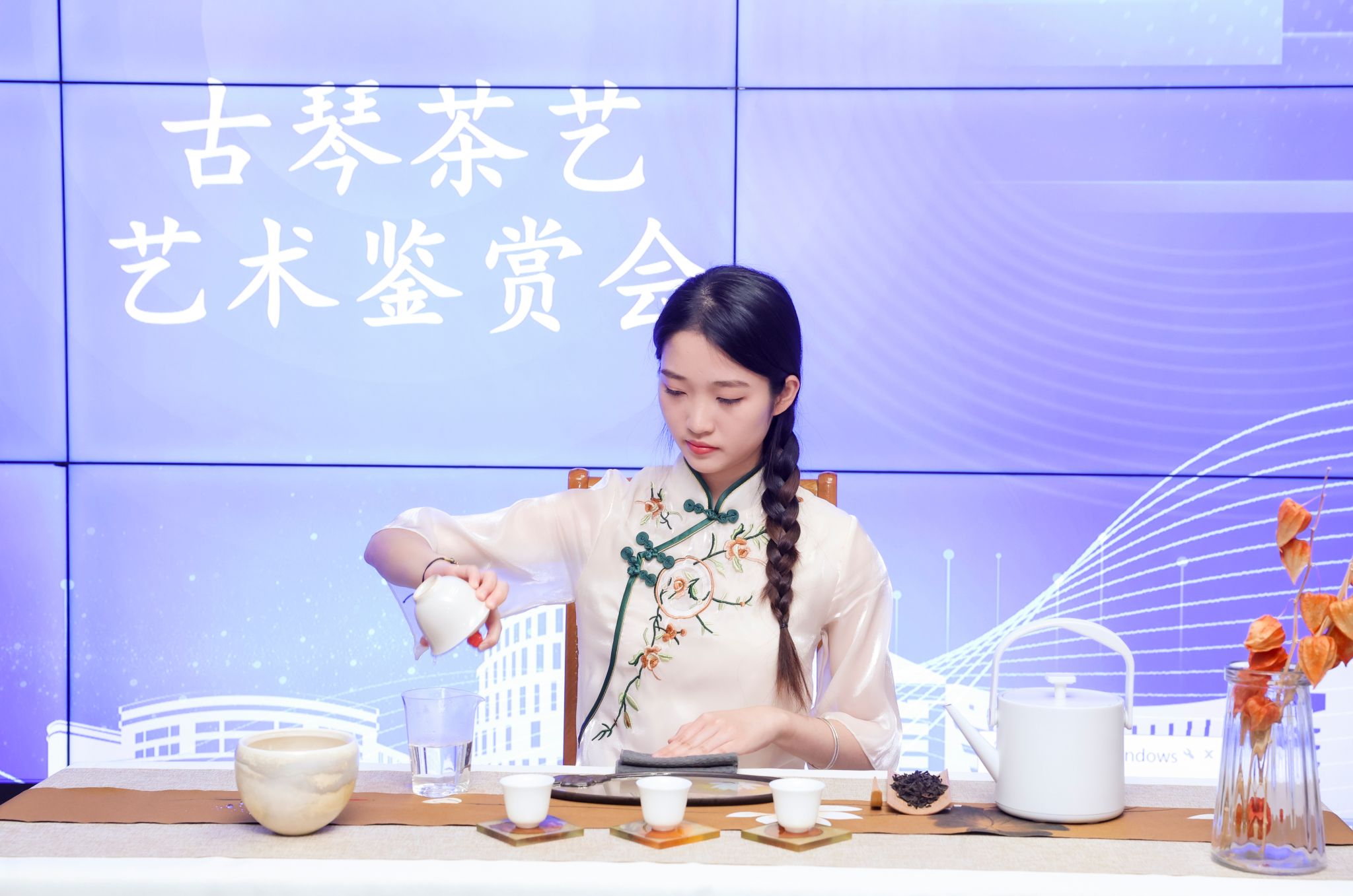 开幕式交流活动的最后,是更加精彩的古琴、茶艺艺术鉴赏会,会上,三明学院仲乐古琴社蔡晨旭老师携两名社团学生为我们表演了一场精彩绝伦的古琴艺术鉴赏会,伴随着悠扬琴声,茶艺社团的同学在现场展现了优雅茶艺。