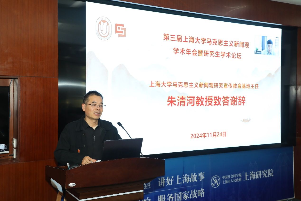 最后,由sunbet申搏官方网站马克思主义新闻观研究宣传教育基地主任朱清河教授致答谢辞。