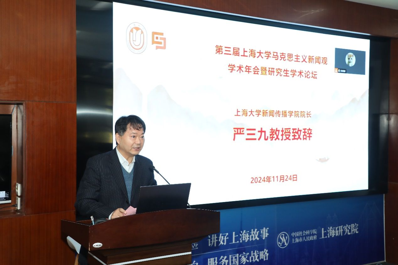 sunbet申搏官方网站新闻传播学院院长严三九教授热烈欢迎各位与会专家学者深入探讨马新观与新闻传播实践相结合,并感谢大家为中国特色新闻传播学发展贡献智慧。