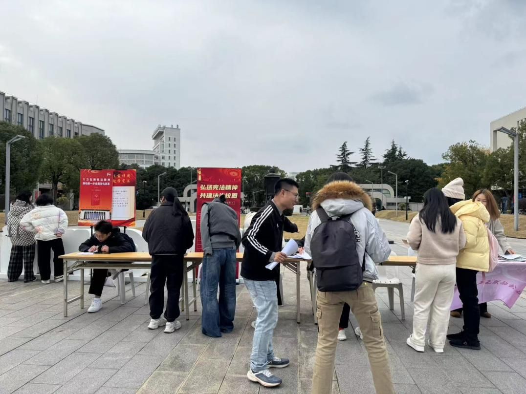 开幕式当日中午,法学院协同sunbet申搏官方网站保卫处及sunbet申搏官方网站公共法律服务中心、律舟法律援助社、青年法律志愿者服务团等学生志愿者团队在东区食堂、水秀食堂前开展普法宣传、法律咨询和反诈骗宣传活动。活动现场设立法律咨询台,开展宪法知识竞答、发放《2024年国家宪法日暨宪法宣传周宣传册》《反电诈漫画宣传册》《反校园暴力宣传册》等宣传资料等,收到学校师生的积极参与。