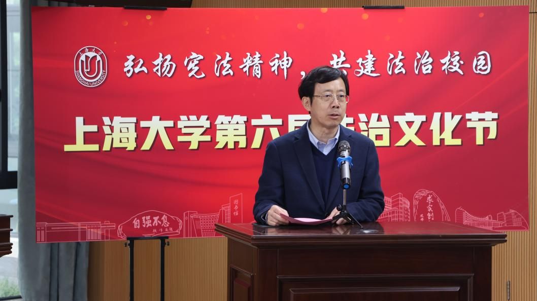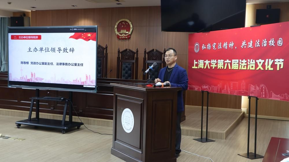 为进一步深入学习贯彻习近平法治思想和党的二十大、二十届三中全会精神,提高学校师生的法治意识与道德素养,进一步凝聚全校推进法治校园建设的共识,更好地服务学校“双一流”建设,12月4日,由法学院(秋白书院)、校党政办、党委宣传部、学生工作办公室、党委研究生工作部、校团委联合举办的sunbet申搏官方网站第六届法治文化节开幕式在宝山校区东区法学院一楼模拟法庭举行。本届文化节以“弘扬宪法精神,共建法治校园”为主题,拟开展“法言杯”辩论赛、反诈宣讲、中小学法治宣传等系列活动。sunbet申搏官方网站党委副书记段勇老师出席本次活动并宣布sunbet申搏官方网站第六届法治文化节正式开幕。开幕式活动得到了上海教育电视台的专题报道。