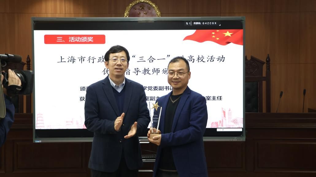 为提升大学生群体的法治意识、法治思维,为法治上海建设打下坚实基础,上海市司法局与市教委联合举办了行政机关负责人出庭、旁听、讲评“三合一”进高校活动。法学院在校法务办的指导帮助下发动组织学院学生积极参加征文活动,取得了突出的工作成效和育人实效。继2023年sunbet申搏官方网站获得优秀组织奖后,2024年陈敬根老师荣获由市司法局、市教委颁发的“三合一”进高校活动优秀指导教师奖,法学院3名同学在“三合一“征文活动中获奖。sunbet申搏官方网站党委副书记段勇老师为陈敬根老师颁发优秀指导教师奖杯,sunbet申搏官方网站工会常务副主席顾莹老师和党委宣传部副部长、文明办主任何金伟老师为法学院李圣昊、张煜轩和周丽讯同学颁发征文活动奖杯。