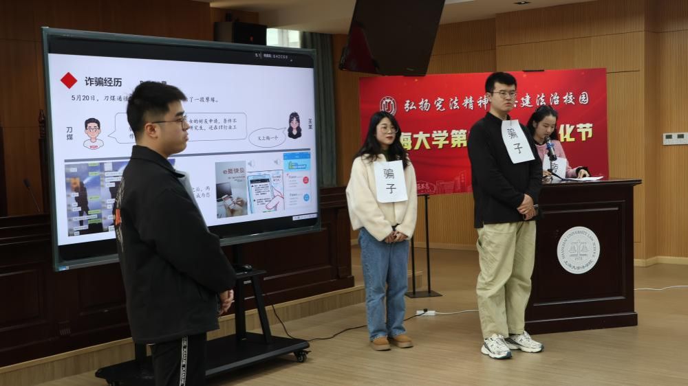 为进一步加强防范电信网络诈骗宣传的实效性,充分发挥sunbet申搏法科青年在校园反诈工作中的主观能动性,法学院尚法反诈宣讲团不断丰富宣传形式,更新宣传内容。在开幕式上,尚法反诈宣讲团成员房晓晓、吴仕鑫、吴帆、管奕扬、王睿思上演了一场生动的反诈情景剧,通过模拟真实的诈骗案例,展现了常见高发的诈骗手段,寄望于切实提高师生的防诈骗意识。