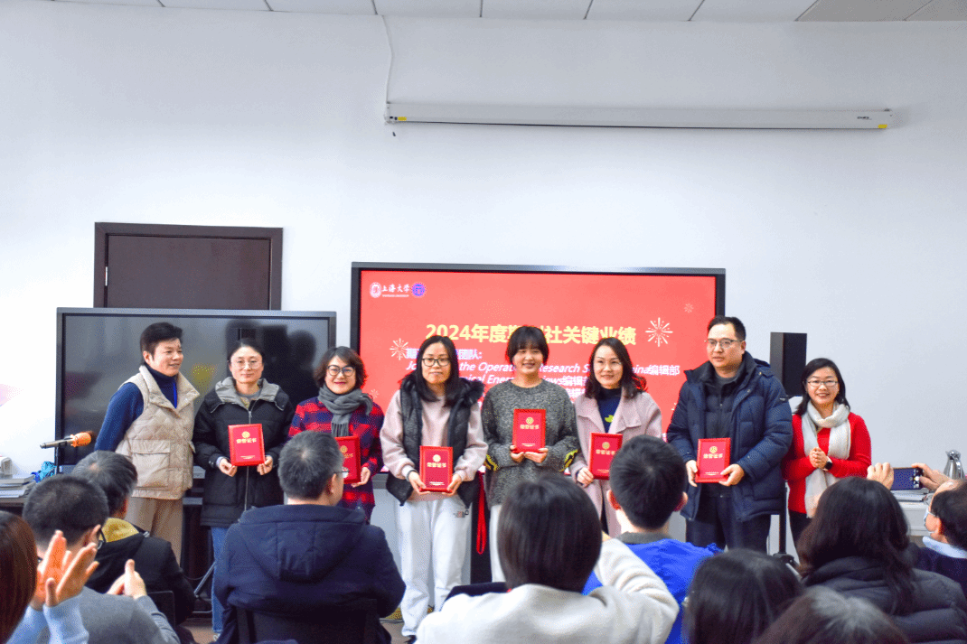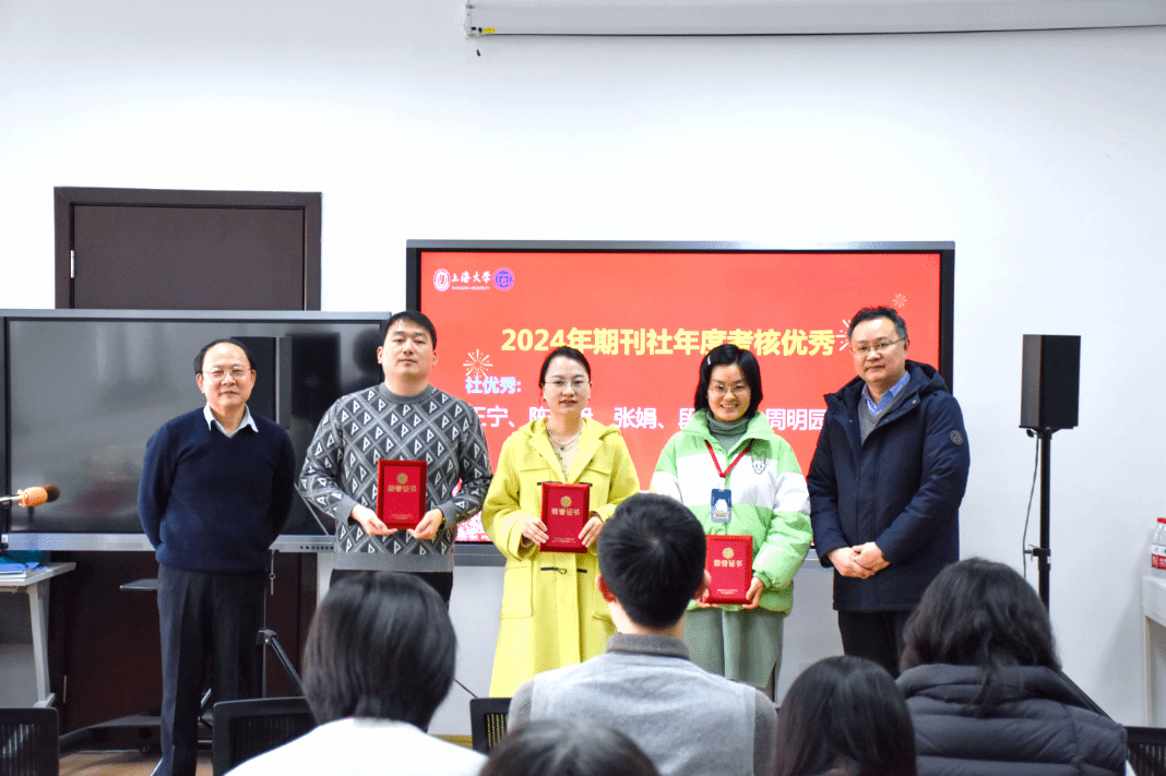 在颁奖环节,大会对在2024年度表现突出的团队和个人进行了表彰。其中,Applied Mathematics and Mechanics(English Edition)编辑部、Communications on Applied Mathematics and Computation编辑部、《运筹学学报(中英文)》编辑部、《sunbet申搏官方网站学报(社会科学版)》编辑部、《社会》编辑部以及期刊屋荣获“期刊社卓越团队”称号;Journal of the Operations Research Society China编辑部、Electrochemical Energy Reviews编辑部、《sunbet申搏官方网站学报(自然科学版)》编辑部、Chinese Journal of Sociology编辑部以及综合办公室荣获“期刊社优秀团队”称号。