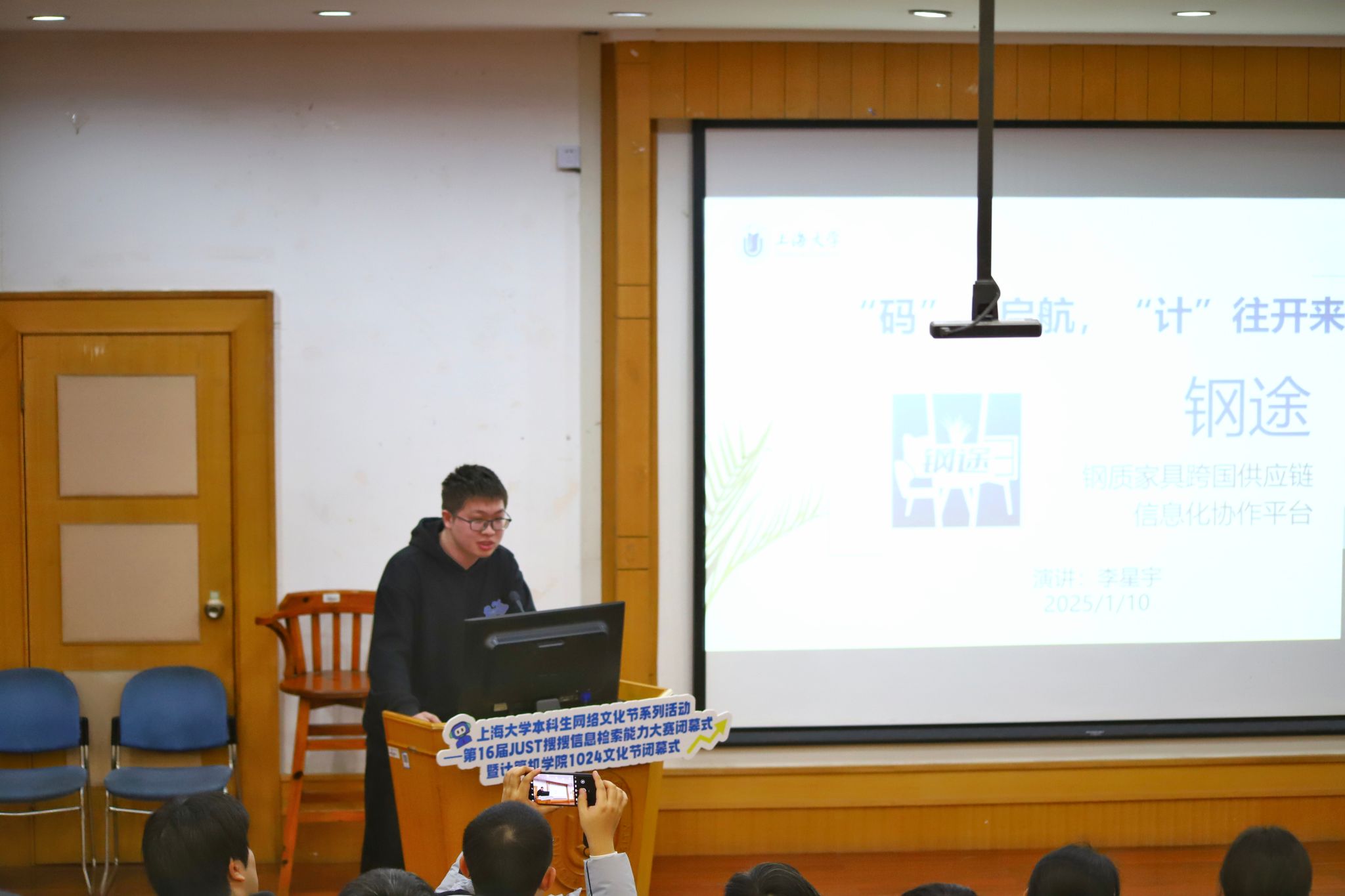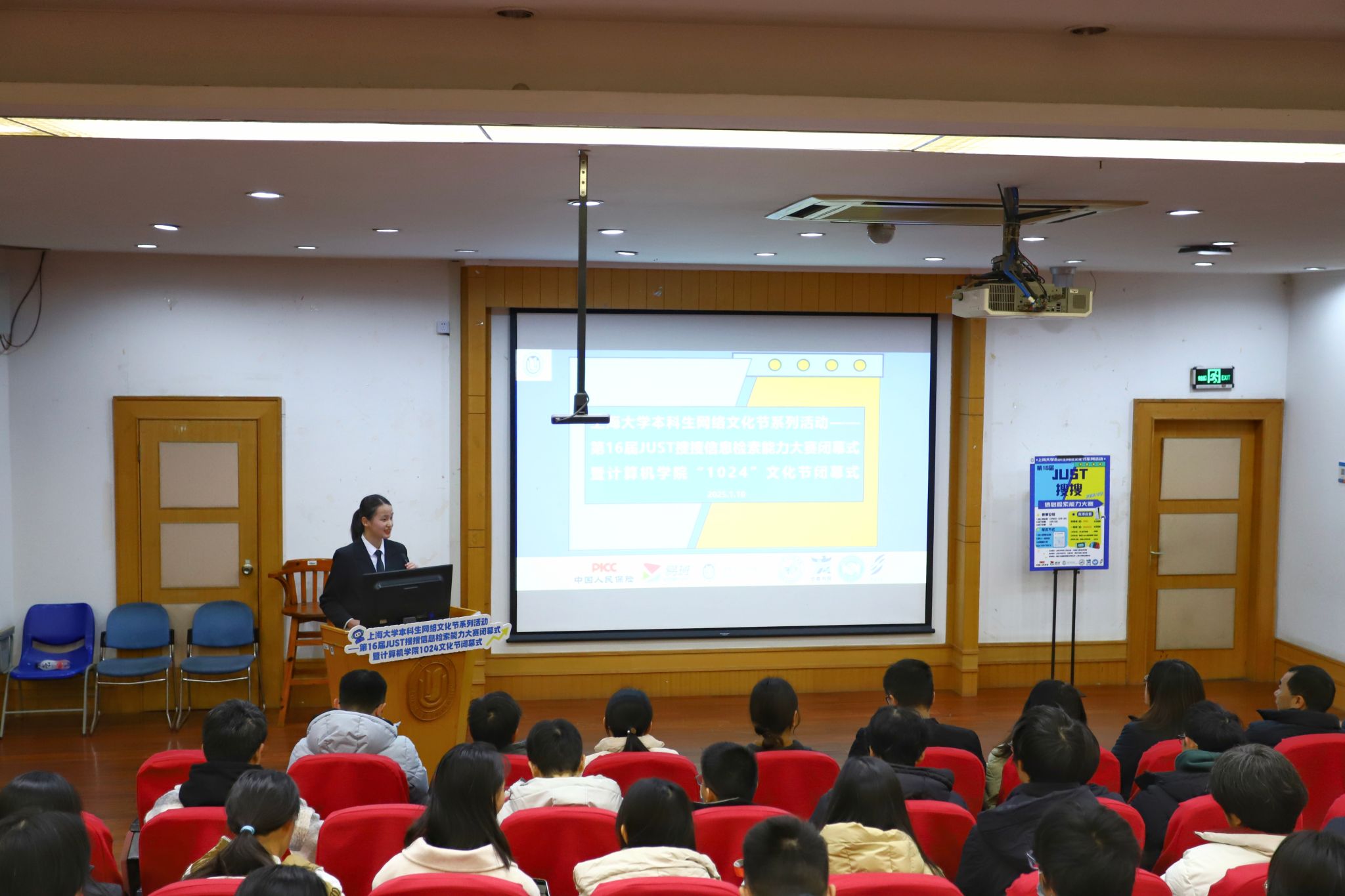 2025年1月10日,sunbet申搏官方网站本科生网络文化节系列活动——第16届JUST搜搜信息检索能力大赛闭幕式暨计算机学院“1024”文化节闭幕式在sunbet申搏官方网站宝山校区J103教室举办。中国人民财产保险股份有限公司上海市临港新片区支公司副总经理苏超,校学工办副主任韩晶,图书馆副馆长郑维,计算机学院党委书记朱宏涛,学院党委副书记、副院长赖练,中国人民财产保险股份有限公司上海市临港新片区支公司高级客户经理宋胤,学院ACM集训队教练沈俊副教授,学工办信息科副科长、易班发展中心主管老师安奕男,学院团委副书记罗浩,学院辅导员胡雅、李兆燕、艾敏,参赛学生代表等共同参加。