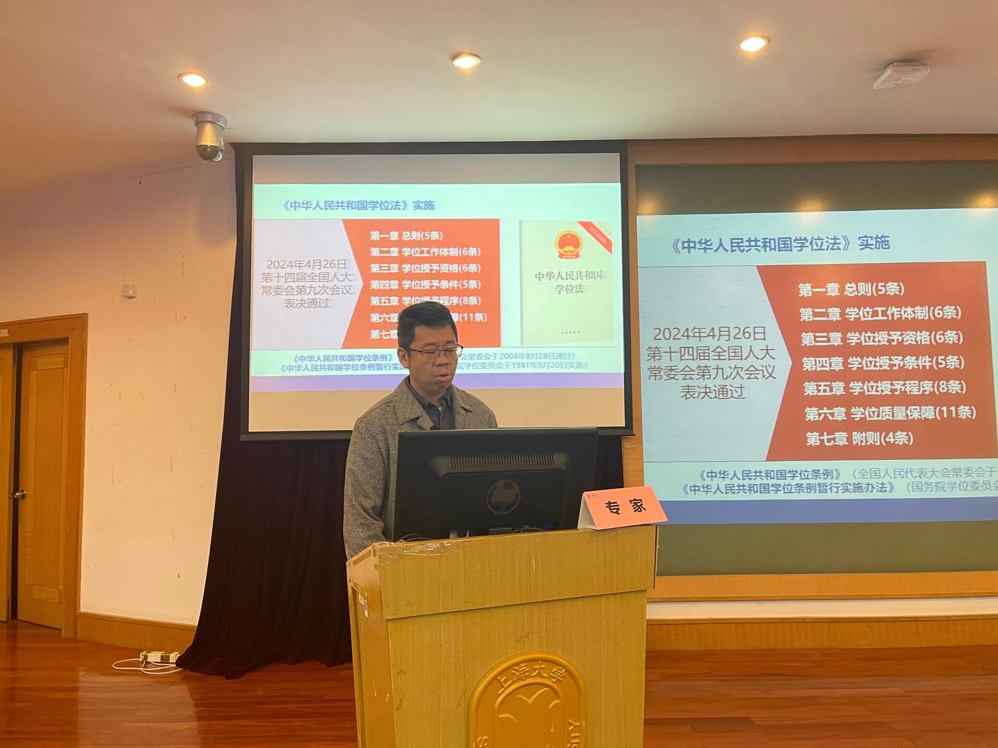 3月4日,sunbet申搏官方网站《中华人民共和国学位法》专题培训会于宝山校区J202开启。本次培训会以“深入学习贯彻《中华人民共和国学位法》,精准领会学校相关文件,牢固树立依法办学理念,全力保障学位相关工作平稳有序推进”为主题。会议特邀华东师范大学高等教育研究所、教育立法研究基地教授姚荣作专题报告。sunbet申搏官方网站学位办副主任魏峭巍主持会议。sunbet申搏官方网站党委常委、副校长聂清致欢迎辞。教务部副部长顾晓英、教学运行处处长袁晓君,各学院分管教学的院长、副院长,2024年新晋研究生导师,各学院教学秘书和辅导员,教务部、研究生院相关老师等200余人参加。