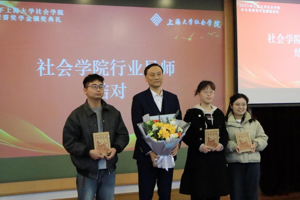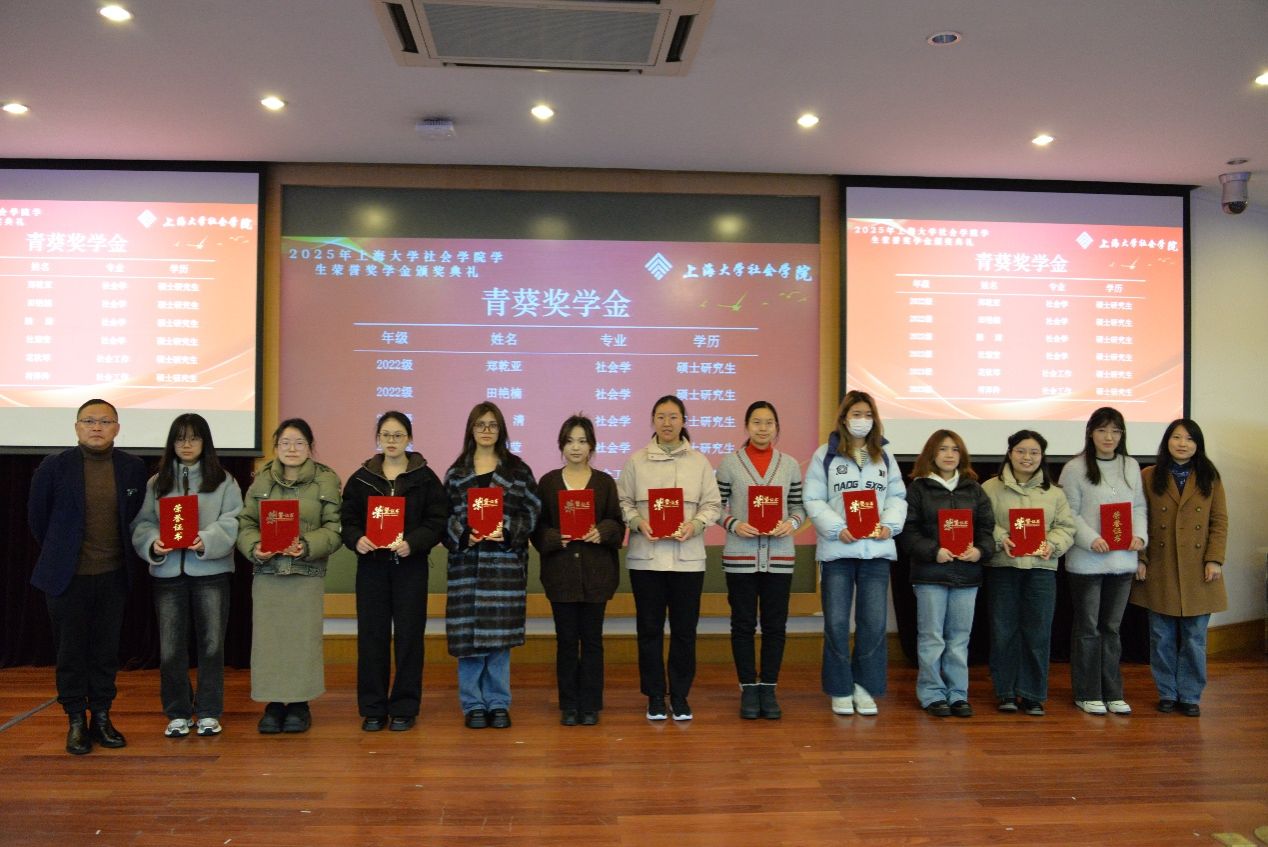 邬亦波、程明明两位嘉宾为热孜亚木·买买提、艾克达·阿力木、赖清等18位同学颁发社会学院青葵奖学金证书。