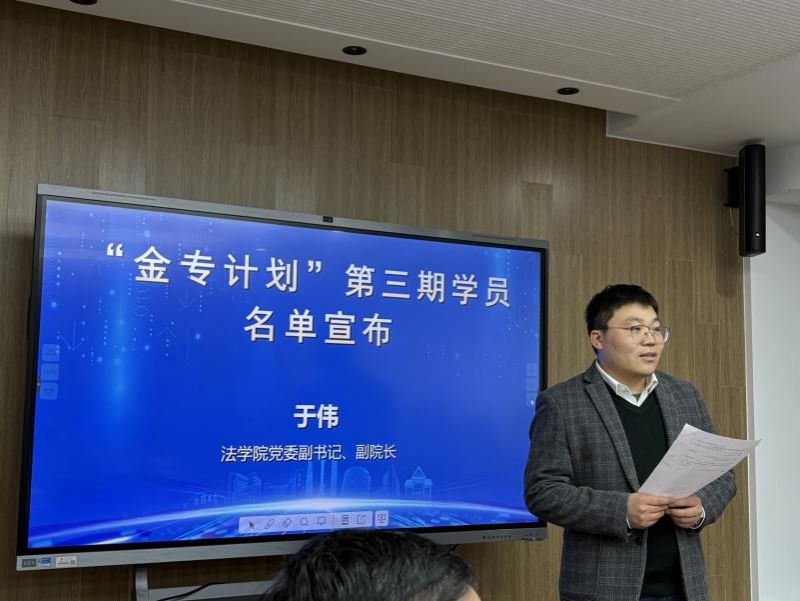 法学院党委副书记、副院长于伟宣读了第三期“金专计划”学员名单,并引用《道德经》中“道生一,一生二,二生三,三生万物”的典句,对金专计划第三期学员成功入学以及计划取得的成绩表示祝贺,对合作单位和授课专家的支持表示诚挚的谢意。