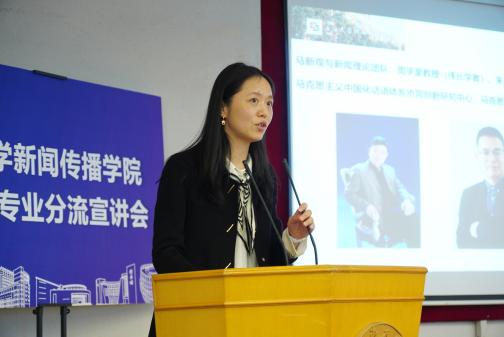 新闻传播学院党委书记王晴川教授在宣讲会上讲话。他强调,新闻传播学院办学特色鲜明且独具优势,可归结为“体制双共建、育人重实践、紧跟融媒体、突出马新观”。学院资源丰富、前景广阔、未来光明,各类实践项目、品牌活动亮点纷呈,有足够的实力为同学们搭建优质成长平台。他期待在场同学能结合自身兴趣爱好和职业规划做出智慧选择,积极加入新闻传播学院这个温暖而又充满活力的大家庭中来,共同书写精彩篇章。