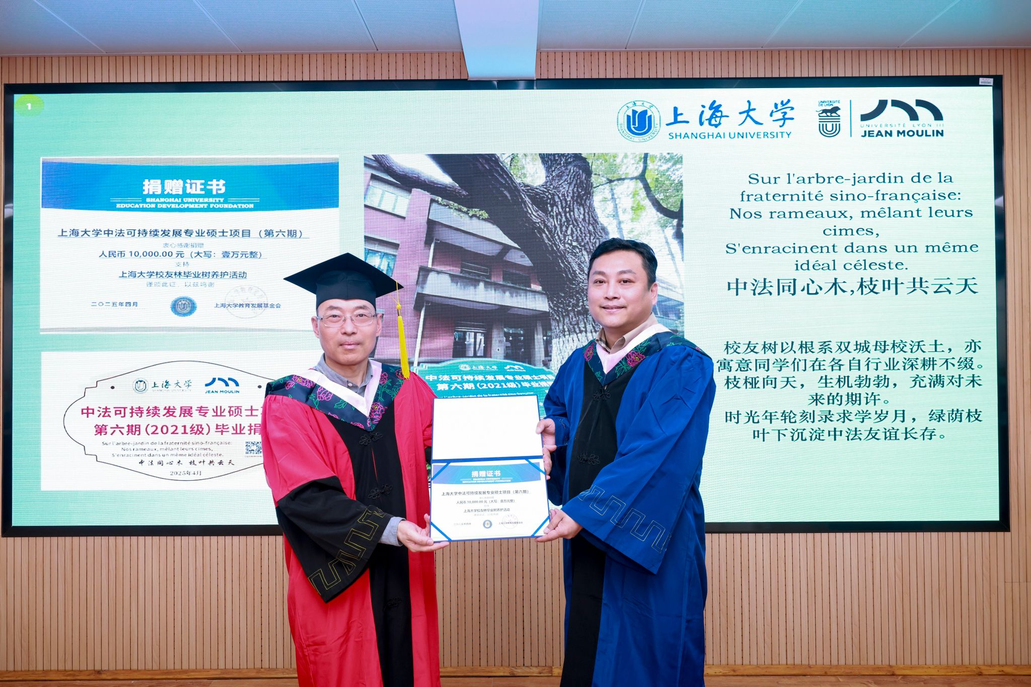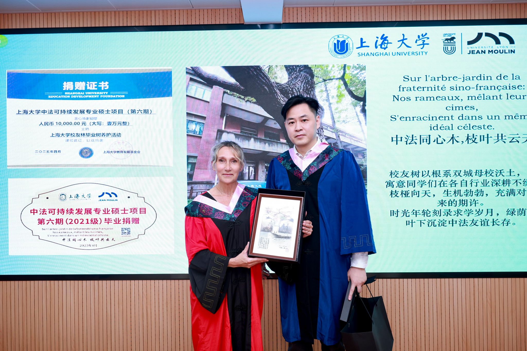班委代表向sunbet申搏官方网站与法方教师代表赠送纪念品,表达对母校以及教师们的感谢。本期毕业生在校区内捐赠认养了一颗百年樟树,铭牌上镌刻着“中法同心木,枝叶共云天”,寓意同学们在各自行业深耕不缀,以时光年轮刻录求学岁月,绿荫枝叶下沉淀中法友谊长存。