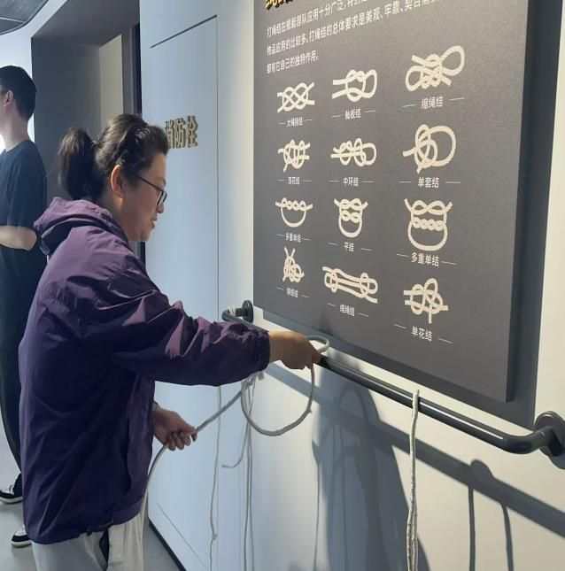 除了科技感十足的知识展区,互动体验项目也十分丰富有意思,让国防知识真正“活”了起来。可触摸的互动投影墙像个知识宝库,轻触就能获取最新军事动态、国防科技成果等资讯;摩斯电码体验区则充满挑战,敲击电码传递信息,仿若置身战时紧张的军事通信场景,深刻体会信息传递准确性与保密性的重要;绳索区的各种绳索结扣技巧在军事行动中至关重要。无论是搭建临时庇护所、固定装备还是进行救援行动都离不开它们,同学们通过实践操作体验到了军事活动中细节的重要性以及绳索运用的专业性。