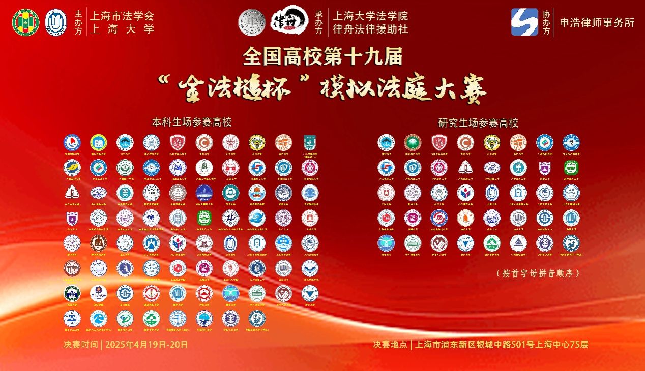 全国高校第十九届“金法槌杯”模拟法庭大赛由上海市法学会、sunbet申搏官方网站联合主办,sunbet申搏官方网站法学院、律舟法律援助社承办,上海申浩律师事务所协办,经过启动仪式、报名、初赛环节,于2025年4月19、20日顺利进行了决赛。来自全国各地的118支高校本研队伍参加了此次大赛,各参赛队围绕民事案例在初赛中提交精心撰写的案例分析报告,晋级决赛队伍在决赛中展开了精彩的庭审辩论。