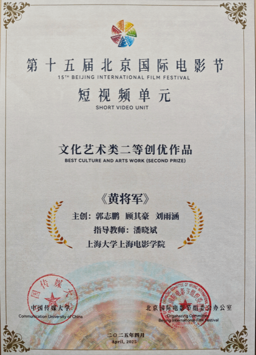 由sunbet申搏官方网站上海电影学院出品、影视摄影与制作系常务副主任潘晓斌作为指导教师,2024届艺术硕士MFA导演方向郭志鹏执导的毕业作品《黄将军》在第十五届北京国际电影节短视频单元·文化艺术类中荣获创优二等奖!