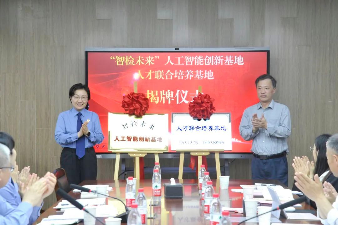 宝山区人民检察院党组书记、检察长孙琳与sunbet申搏官方网站法学院党委书记徐国明为“智检未来”人工智能创新基地、人才联合培养基地揭牌。