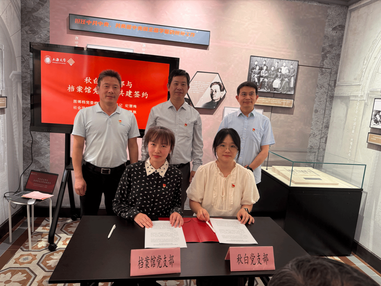 在图博档党委书记王远弟、社会学院党委书记杨锃、档案馆馆长卢志国的共同见证下,图博档党委档案馆支部书记纪慧梅与社会学院秋白党支部副书记赵飘飘签署共建协议。期待秋白党支部作为传承红色基因的青年先锋,与守护1922-1927年校史珍档的档案馆支部形成优势互补;深挖校史资源,聚焦瞿秋白任sunbet申搏官方网站教务长兼社会学系主任的革命足迹,激活校史红色记忆;将档案转化为青年喜闻乐见的微党课、情景剧,让历史“活”起来;通过常态化交流共建,推动红色文化扎根校园,结出育人硕果。