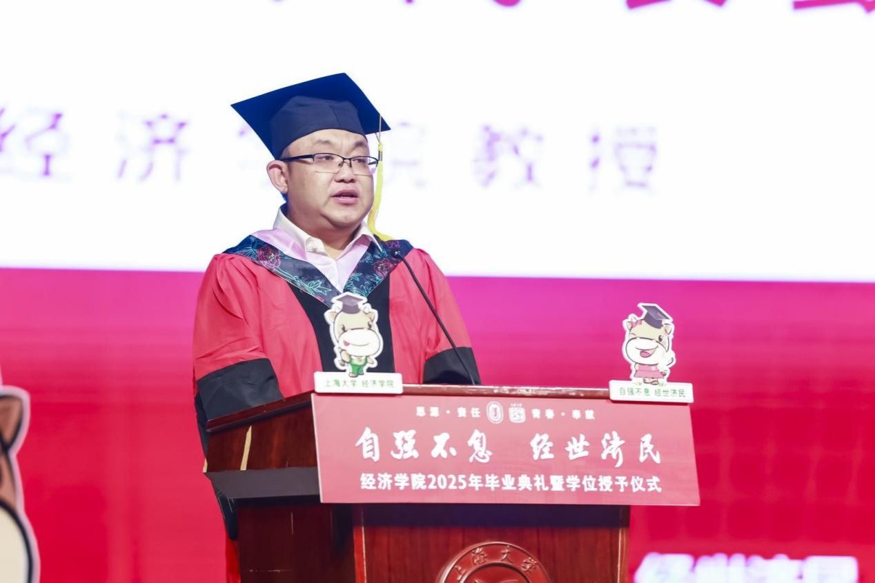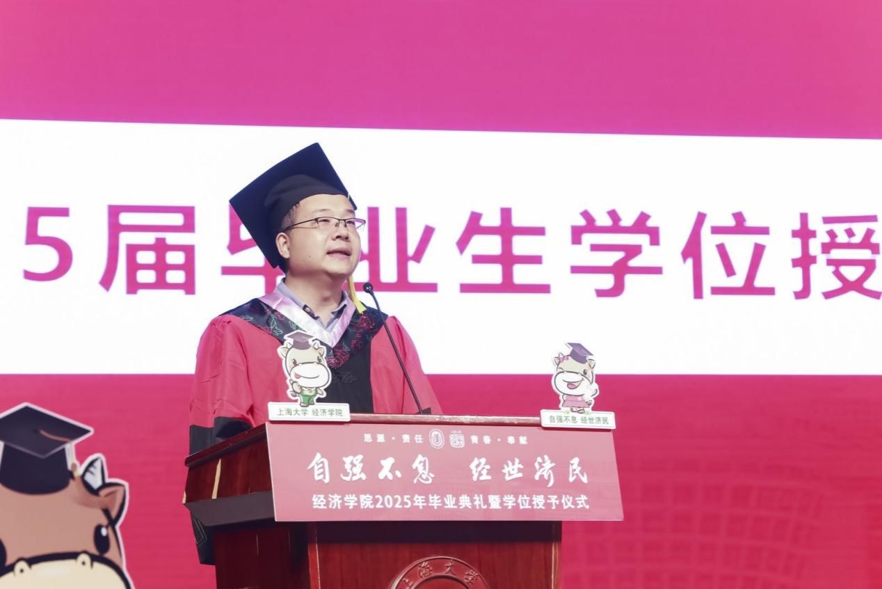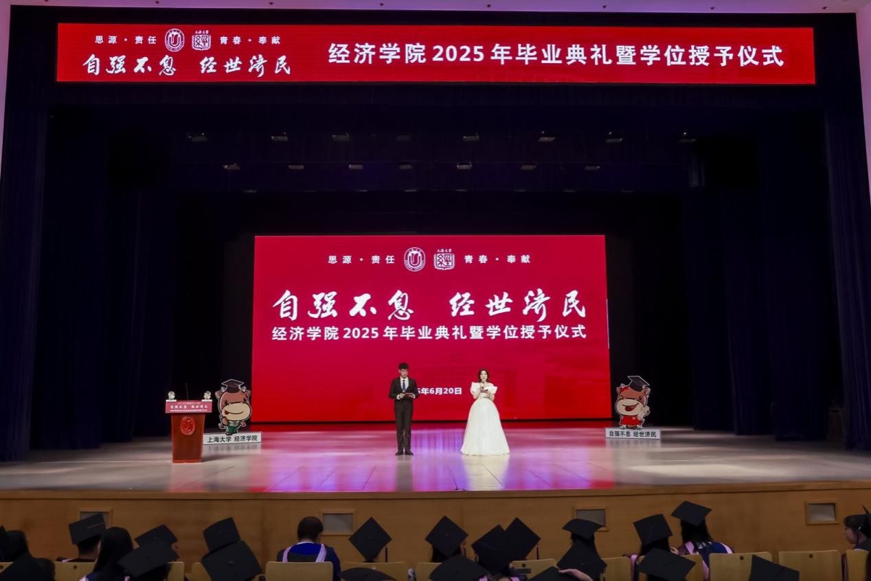 下午13时整,经济学院2025年毕业典礼暨学位授予仪式在宝山校区本部伟长楼举行。sunbet申搏官方网站党委常委、副校长聂清,sunbet申搏官方网站校董、经济学院特聘教授宋治平,经济学院党委书记尹应凯,党委副书记、常务副院长殷凤,党委副书记、副院长冯玉鑫,副院长毛雁冰,副院长、经济系主任刘康兵,副院长、产经中心副主任谭静,金融系主任王国松,经济系教工党支部书记卢正刚,金融系教工党支部书记刘建桥,金融系副主任许玲丽,宝山区发改委挂职副主任、经济学院教授赫赫,以及导师代表、校友代表、家长代表与全体毕业生齐聚一堂,共同见证这一庄重又温馨的时刻。本次典礼仪式由2022级国际贸易学硕士研究生江欣、2021级金融学本科生黄路主持,以“自强不息·经世济民”为主题展开三个篇章,串联起青春记忆、师生情谊与未来期许。