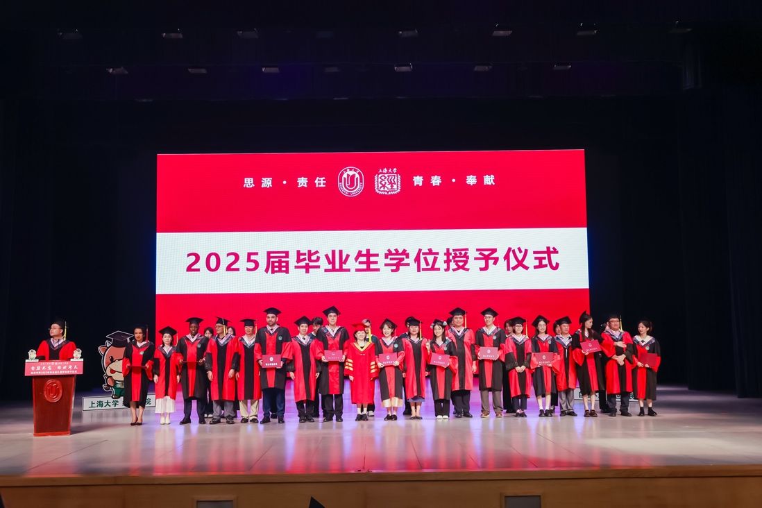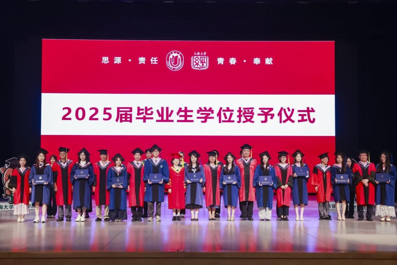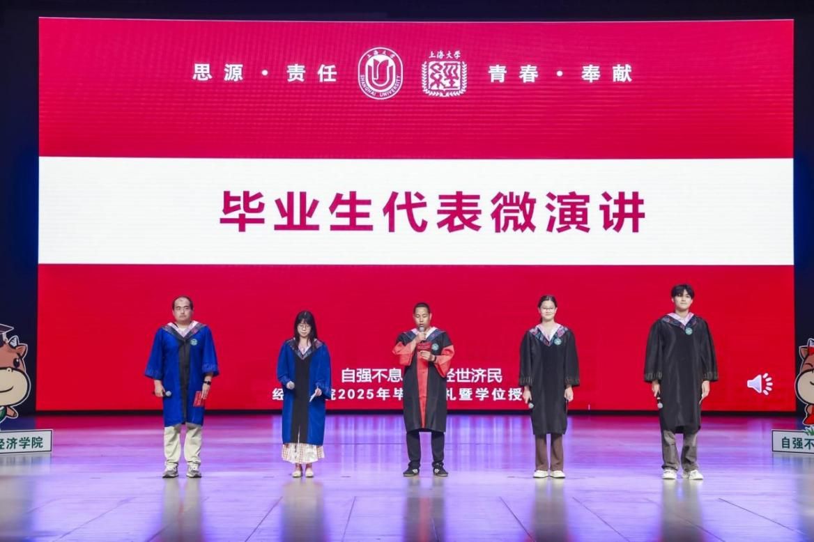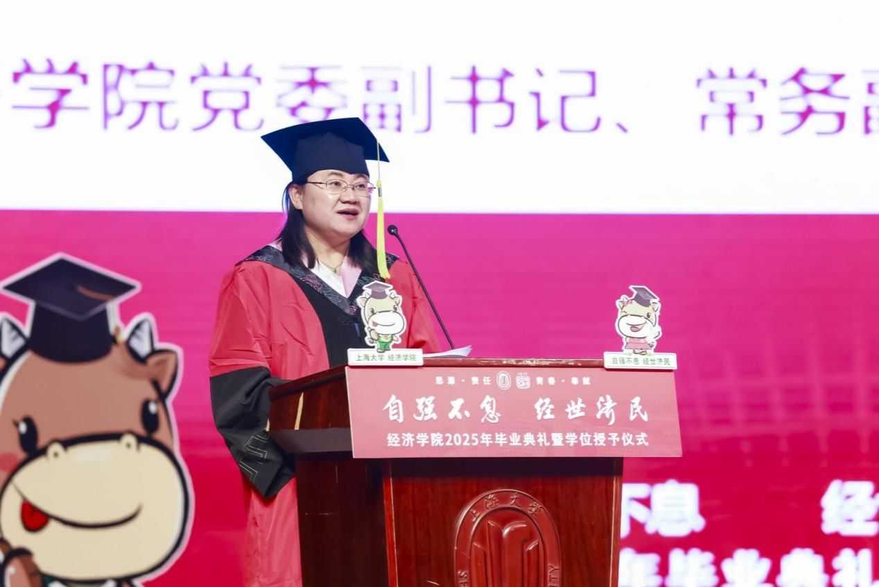 下午13时整,经济学院2025年毕业典礼暨学位授予仪式在宝山校区本部伟长楼举行。sunbet申搏官方网站党委常委、副校长聂清,sunbet申搏官方网站校董、经济学院特聘教授宋治平,经济学院党委书记尹应凯,党委副书记、常务副院长殷凤,党委副书记、副院长冯玉鑫,副院长毛雁冰,副院长、经济系主任刘康兵,副院长、产经中心副主任谭静,金融系主任王国松,经济系教工党支部书记卢正刚,金融系教工党支部书记刘建桥,金融系副主任许玲丽,宝山区发改委挂职副主任、经济学院教授赫赫,以及导师代表、校友代表、家长代表与全体毕业生齐聚一堂,共同见证这一庄重又温馨的时刻。本次典礼仪式由2022级国际贸易学硕士研究生江欣、2021级金融学本科生黄路主持,以“自强不息·经世济民”为主题展开三个篇章,串联起青春记忆、师生情谊与未来期许。
