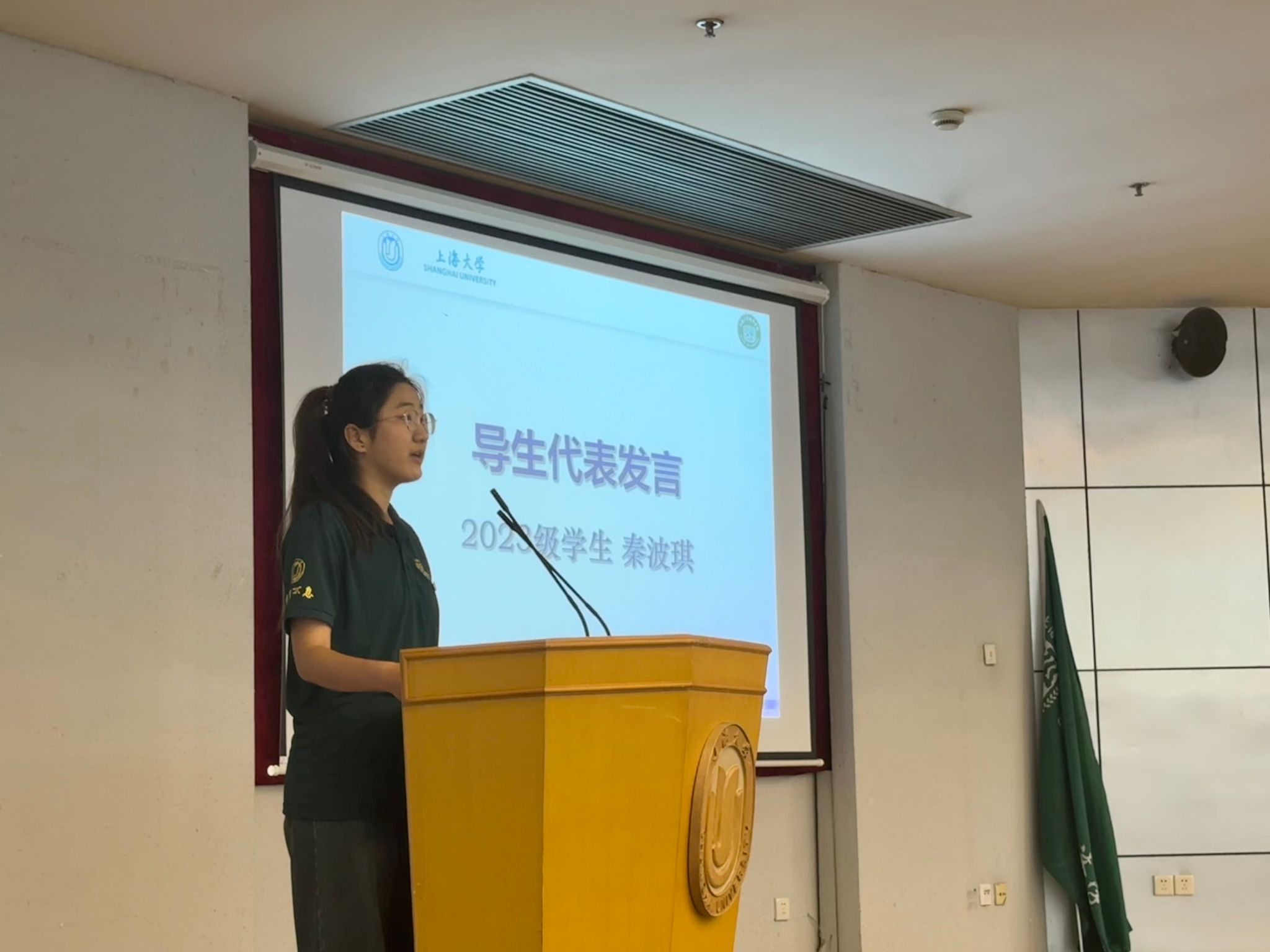 导生代表秦波琪发言,以《在经院遇见成长,用热爱点亮未来》为题,回顾从去年新生代表到如今导生的心境转变,谈及学长学姐的帮助促使其成为导生传递温暖。结合大学经历,从自信、自律、合作、坚强四方面分享心得,呼吁同学们在经院践行“经世济民”誓言。