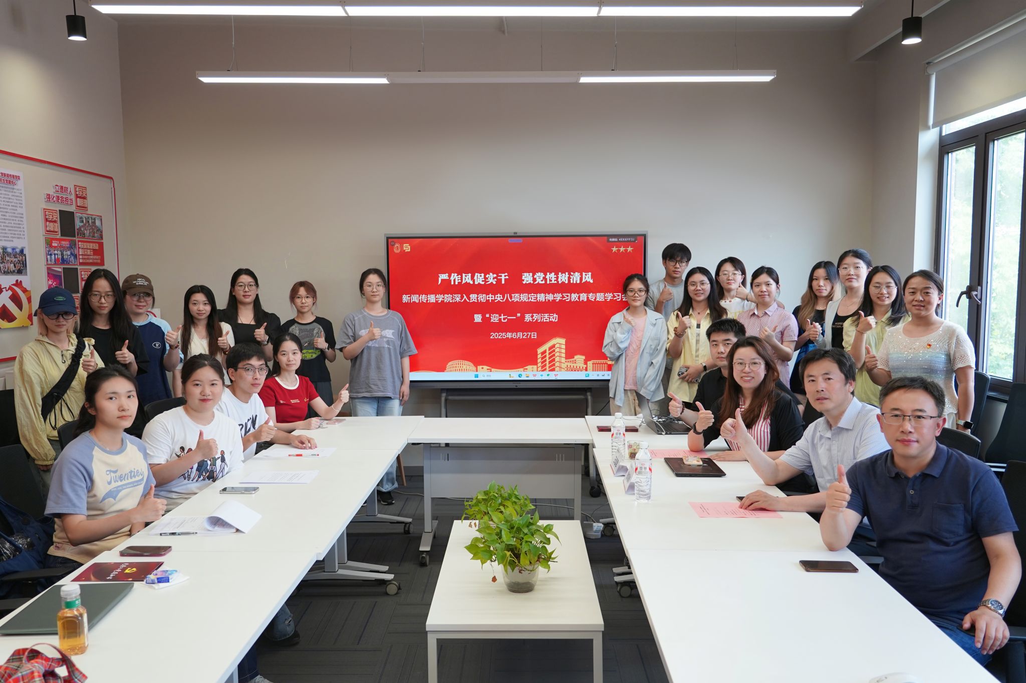 为深入学习贯彻习近平新时代中国特色社会主义思想和党的二十大、二十届三中全会精神,持续贯彻落实中央八项规定精神学习教育,在“七一”建党节来临之际,sunbet申搏官方网站新闻传播学院于6月27日下午,在延长校区智能传播创新实验中心413会议室召开“严作风促实干,强党性树清风”专题学习会暨“迎七一”系列活动。会议由24级新闻传播学研究生何鑫主持,sunbet申搏官方网站马克思主义学院马克思主义中国化教研部主任徐海峰教授,新闻传播学院党委副书记、副院长王智君,副院长牛盼强以及师生党员代表参加了会议。