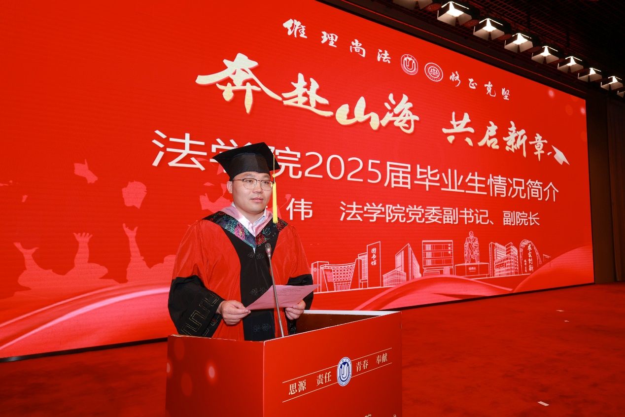 法学院党委副书记、副院长于伟副研究员介绍法学院2025年毕业生的整体情况。2025年,法学院共有141名全日制硕士研究生、106名本科生和47名非全日制硕士研究生顺利毕业,涌现出荣获sunbet申搏官方网站本科生最高荣誉校长奖学金、上海市奖学金及法学院最高荣誉法学之星等的多名优秀学生,其中40余名同学前往中国人民大学、中国政法大学、复旦大学、同济大学、厦门大学、伦敦国王学院、悉尼大学、波士顿大学、香港中文大学等国内外知名学府继续深造,升学深造率再创新高;学院本科生中夏党支部全体党员已达到86.67%的阶段高质量就业。百余名毕业生已经落实政府公务员、律所、公司法务、事业单位等就业去向,充分彰显学院卓越法治人才的培养成果。