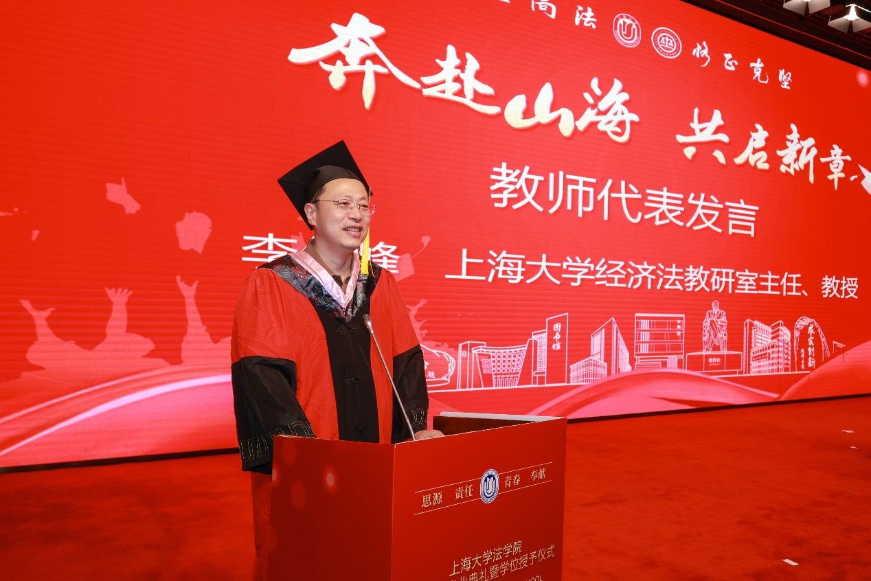 sunbet申搏官方网站法学院经济法教研室主任李俊峰教授作为教师代表向毕业生们送上三点寄语。其一,“不要怕”,既不要畏惧求职求学之路上的难题,艰难险阻咬牙亦能闯过,也不要害怕未来的不确定性,将其视作创造无限可能的机遇,坦然欣然面向未知。其二,“要向善”,同学们未来从事法律相关职业,一举一动关联重大利害,当以良善之心用能力、掌权力,哪怕是微小地让世界更美好,也能收获相应的回报。其三,“爱智慧”,法律人要拥有洞察事物本质的智慧,这不仅是爱知识、爱思考,更是对真理的热切渴望,在实践中把握权衡抉择,做到终身学习、独立思考,不盲目、不固执,以此从容应对世间万象。最后,老老师嘱咐学生们常回母校看看,并祝愿毕业生们事业有成、生活幸福。